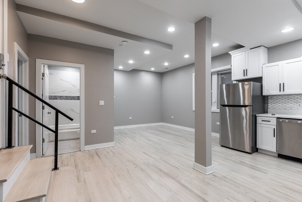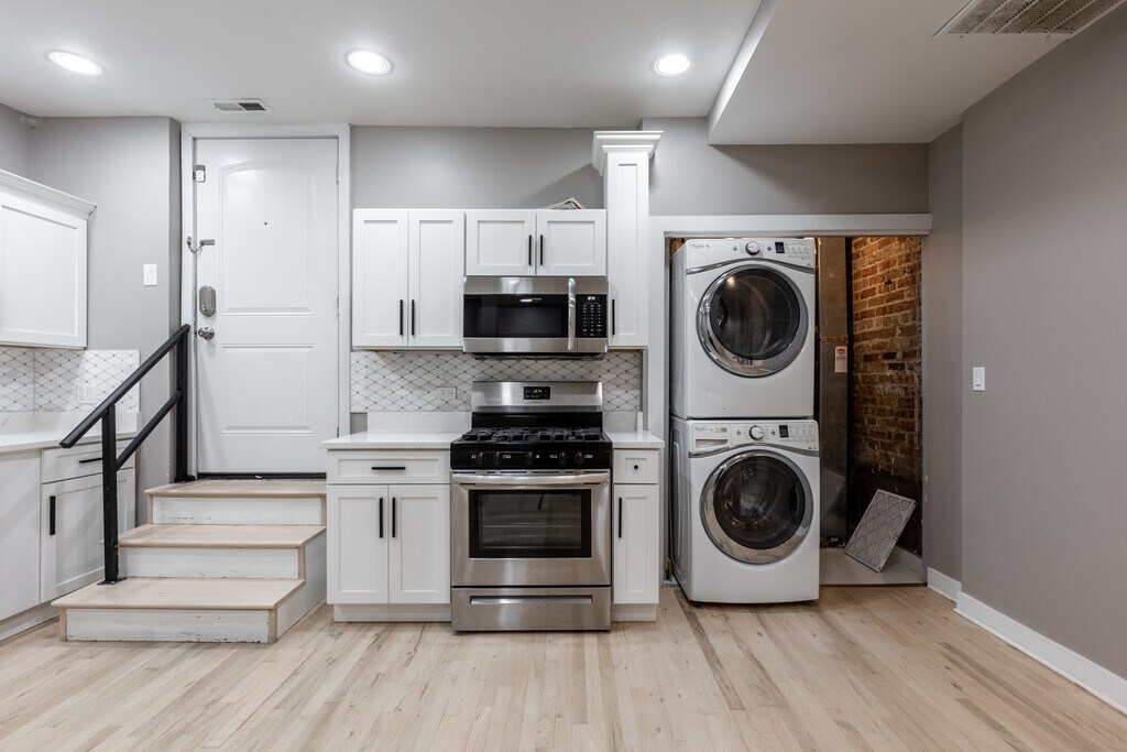 bed/1 bath + storage unit in West Wicker Park [700 ft²] Beautifully updated (2022), modern, and large 1 bed / 1 bath unit in prime West Wicker Park neighborhood of Chicago. 700 square foot garden unit within a 15-unit building offers abundant natural light, brand new re-finished hardwood flooring, and an open floor plan seamlessly connecting the living room with the kitchen (ideal live/work space). Kitchen features new (custom) soft-close cabinets, new quartz countertop, new stainless steel appliances (including built-in microwave and dishwasher), garbage disposal, and Moen fixtures. Queen-sized bedroom and newly updated bath. Additional upgrades include: a smart digital thermostat (Google Nest) for year-round comfort; water detectors for added peace of mind; elegant, energy-efficient recessed LED lighting throughout; new additional light fixtures; and new premium paint throughout. Central heating & cooling, along with an in-unit washer/dryer (front-loading Whirlpool steam) provide convenience and comfort. Includes one (1) storage locker (4' x 6'; indoors, secured/locked, private) assigned to unit. Large common storage room can also secure/store bicycle(s). No security deposit; one-time $500 non-refundable move-in fee per tenant. Pet friendly ($250 initial fee for dogs; $150 for cats + $25 /mo pet rent).