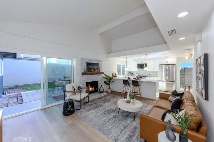 Property Id: 2425665 Single-story single-family home with fully renovated interior and modern finishes, located at 14452 Denbigh Lane, Tustin, CA 92780 in the Broadmoor Exclusives community. This Model 2 Custom Residence offers 3 bedrooms, 2 bathrooms, and 1,526 square feet of updated living space within a neighborhood of 128 homes built by Broadmoor. Entry begins through new double front doors into a defined landing with a closed coat closet. The living room is filled with natural light from a large sliding door opening to the atrium. The adjacent dining area connects seamlessly to the living space and includes recessed lighting. Continuing through the home, the family room features a fireplace with a wood mantel, recessed lighting, and open flow into the kitchen. The kitchen has been fully redone with quartz countertops, a matching quartz backsplash, shaker-style cabinetry, and a bar top seating area. Stainless steel appliances include an electric range, microwave, dishwasher, and refrigerator. A deep si