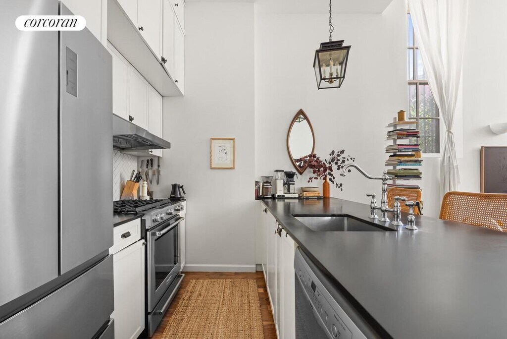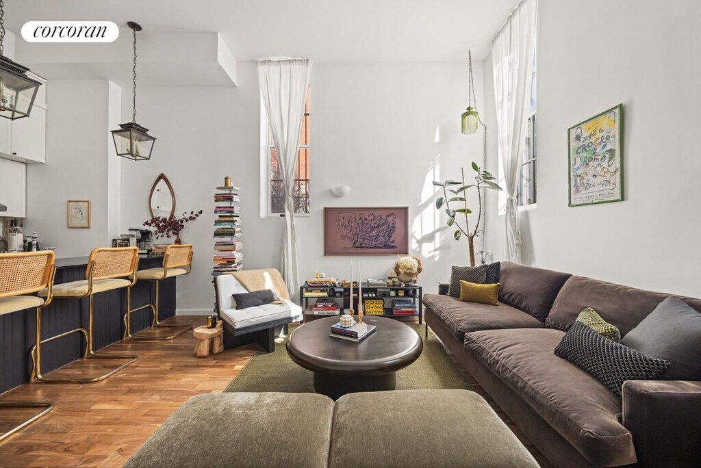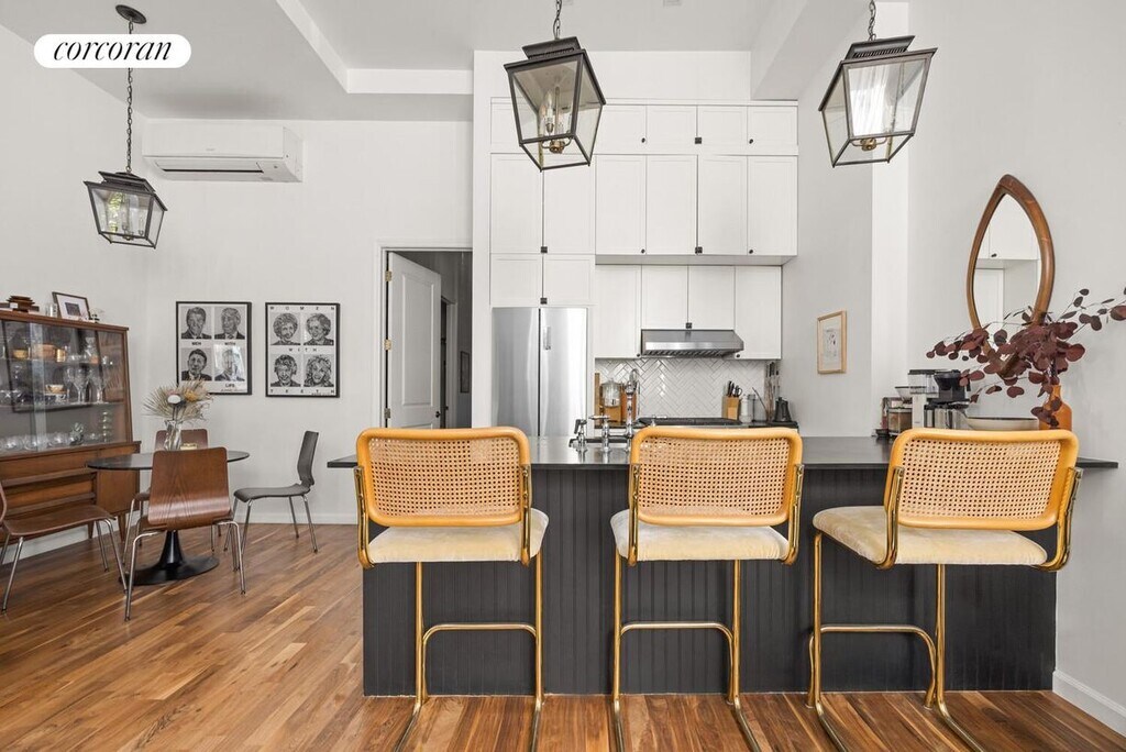 Clinton Hill Duplex on a Landmarked Block in Prime Location!Spacious one-bedroom, two-bathroom duplex apartment with an enormous recreation space on the lower level. Features include in-unit washer & dryer, independent heating and cooling in each room, and soaring 12'3" ceilings.Your oasis begins as you step through the trellis-covered path leading to the unit's private entrance off Grand Avenue. You might feel transported to Europe as you stroll down the garden walkway to the exterior foyer, a perfect spot to leave muddy shoes and wet umbrellas outside your living space.Inside, you're greeted by 12'3" ceilings, dual exposures, and abundant sunlight. The living area features stylish pendant lights and sconces, creating a warm, inviting atmosphere. The generous living room flows seamlessly into the open kitchen, complete with a breakfast bar, full-size appliances, and European-inspired finishes and hardware. A dedicated dining area comfortably fits a table for six.At the quiet rear of the home, the large bedroom offers space for a king-size bed plus additional furniture. It features an en-suite bathroom, a fully built-out walk-in closet, and designer lighting to set the mood.Head downstairs to the enormous recreation room, which boasts 10' ceilings, a second full bathroom, and a second washer & dryer. This flexible space can be adapted for use as a studio, office, guest suite, or entertainment room - the possibilities are endless.Location Highlights: 145 Gates Ave (at Grand Ave) G train at Clinton-Washington C train at Clinton-Washington Citi Bike stations nearby Easy street parking Neighborhood favorites include Locanda Vini & Olii, Speedy Romeo, Emily, S'mor, Casanara, Salon 718, Dou Yoga - all just moments away. Grocery stores and daily conveniences are just one block away on Fulton Street.