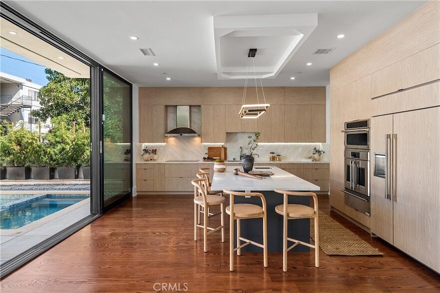 Situated South of the Boulevard on one of the most desirable streets in Sherman Oaks, this newly constructed gated estate offers a 5-bed, 6-bath main house and 1-bed, 1-bath ADU. Designed for modern living, the bright and airy open-concept floor plan is highlighted by lofty ceilings and walls of glass that flood the space with warm natural light. A culinary enthusiast's dream, the gourmet kitchen comes equipped with top-of-the-line Monogram appliances, quartz countertops and a large island with bar seating. The spacious family room features a sleek fireplace and floor-to-ceiling sliding glass door that spans into the kitchen, seamlessly extending your living space outside for true indoor-outdoor living. Head outside to your serene backyard retreat, where you can take a refreshing dip in the sparkling pool/spa, entertain guests in style or relax in total tranquility. Rounding out the main level is a formal living/dining room with a built-in wine cabinet and additional oversized sliding glass door that opens to a side courtyard, along with an ensuite bedroom and powder bathroom. Ascend the floating staircase to find four generously sized ensuite bedrooms and a dedicated laundry room. Unparalleled luxury awaits you in the expansive primary suite, which boasts a private patio, custom walk-in closet and lavish ensuite bathroom, complete with a soaking tub, oversized rainfall shower, smart toilet and double vanity. At the rear of the property, a versatile 1-bed, 1-bath ADU with a living room and full kitchen provides the perfect space for extended family, guests, an office or home gym the possibilities are endless. Additional highlights include solid hardwood floors, a security system, central vacuum, high end Fleetwood pivoting front door, two-car garage with a frameless glass door and a gated driveway. Perfectly positioned in the heart of Sherman Oaks, this property is only moments away from trendy restaurants and boutique shops found along Ventura Boulevard, and offers easy access to the Valley, Westside, 101/405 freeway and so much more.