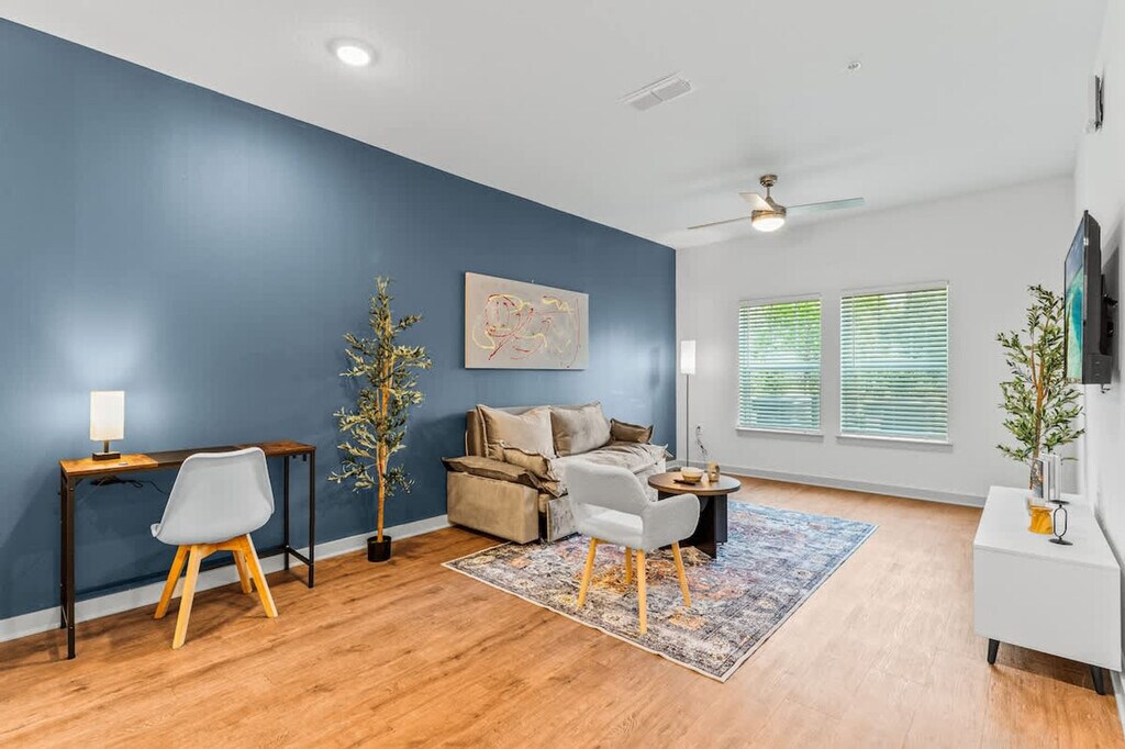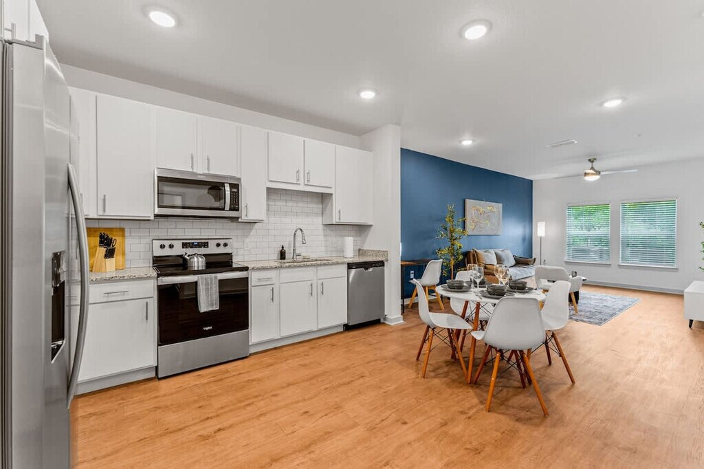 The advertised rate of $3,553/month is the lowest available price, based on a 30 day(s) stay with a move-in date of July 3, 2026. Rates vary depending on the duration of stay, season, and other parameters. For exact pricing and additional pricing components, please visit our website and enter your desired move-in and move-out dates. The rate is applicable when billed upfront; it can be higher if billed in multiple payments. Welcome to your magical gateway, just 10 minutes from Orlando's magical parks. Perfectly located for Disney and Universal, this apartment offers a peaceful retreat with all the comforts of home. Sleeping up to 4 people, you’ll feel at home in this cozy space. This apartment features a living room with a queen-size sofa bed and a 50" smart TV. The bedroom includes a plush king-size bed, a 43" smart TV, a ceiling fan, and a walk-in closet with storage, hangers, an iron, and an ironing board. The fully equipped kitchen has a stove, microwave, refrigerator, coffee maker, dishwasher, a full set of cookware and utensils, and a dining table with 4 chairs. The bathroom offers a relaxing bathtub and shower, along with complimentary toiletries such as shampoo, conditioner, shower gel, hand soap, towels, and a hairdryer. For your convenience, there is also an in-unit washer and dryer. Complimentary parking is available for up to 3 cars. An EV charger is available for electric vehicles, subject to availability, with a fee applied when used. A pack 'n play crib is also provided, including a crib sheet and blanket. Luggage drop-off is available after 12:30 PM with advance notification. This apartment is a short drive to Disney Parks, including Magic Kingdom, EPCOT, Animal Kingdom, and Hollywood Studios, and about 20 minutes from Universal Studios, home to The Wizarding World of Harry Potter. You'll also find vibrant shops, restaurants, bars, and recreational spots close to the property, many within walking distance. Pets are welcome, but some breed restrictions apply. Quiet hours are between 10:00 PM and 8:00 AM. Standard check-in time is 4 PM, but early check-ins can be arranged when possible. This is a smoke-free community. [SI]