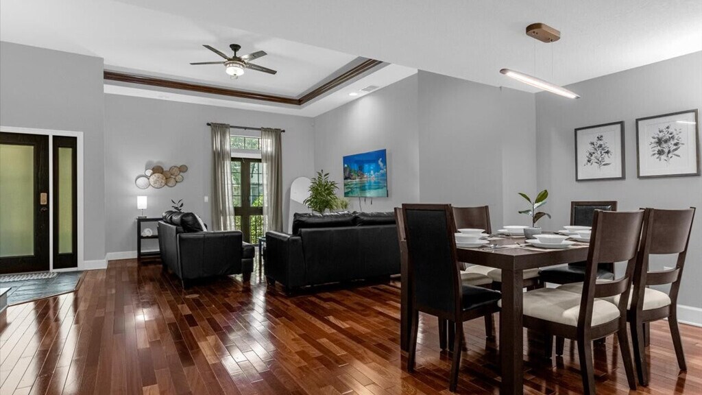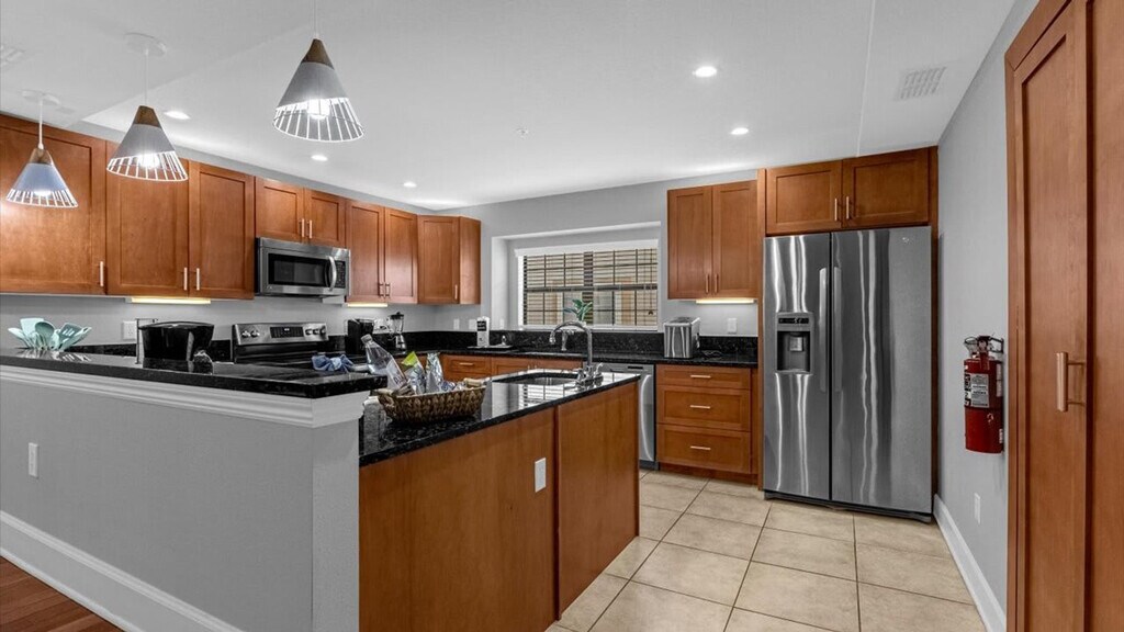 Step into a beautifully designed, split-level townhome that blends stylish modern décor with practical comfort across three spacious stories. Whether you're here to relax or explore, this thoughtfully crafted space offers the perfect balance of luxury and convenience. This townhome features 4 bedrooms and 3.5 bathrooms, making it perfect for families or group stays. Welcome to this elegant townhome where comfort meets elegance. The master bedroom boasts a king-size bed with a private en-suite bathroom, while the other bedrooms offer a mix of full-size and queen-size beds with shared or private bathrooms. The gourmet kitchen includes granite countertops and high-end stainless steel appliances, complemented by open-concept living and dining areas ideal for entertaining or relaxing. Enjoy resort-style amenities such as a swimming pool with a sundeck, a modern fitness center, and tranquil gardens. Pets are welcome with a fee. Only dogs are allowed, with a maximum of two per reservation. There are two designated parking spots in the carport of each unit, and extra free parking spots by the gate. Lake Buena Vista is a vibrant neighborhood situated in the heart of the Orlando-Kissimmee metropolitan area in Florida, renowned for its close proximity to world-famous theme parks and entertainment complexes. At the center of Lake Buena Vista is the Walt Disney World Resort, one of the most iconic and visited tourist destinations in the world. Beyond Disney, the neighborhood is also home to other major attractions such as Disney Springs, Universal Orlando Resort, and SeaWorld Orlando. With a mix of housing options and resort-style amenities, Lake Buena Vista offers a dynamic and exciting lifestyle with its proximity to world-class theme parks and entertainment complexes. Quiet hours are between 22:00 and 8:00. Please comply with the parking regulations. Ensure the A/C temperature remains set at or above 72ºF to prevent system issues. [SI]