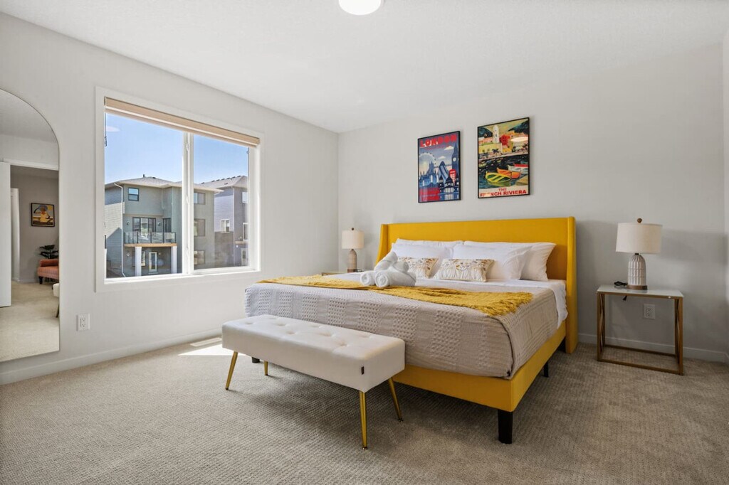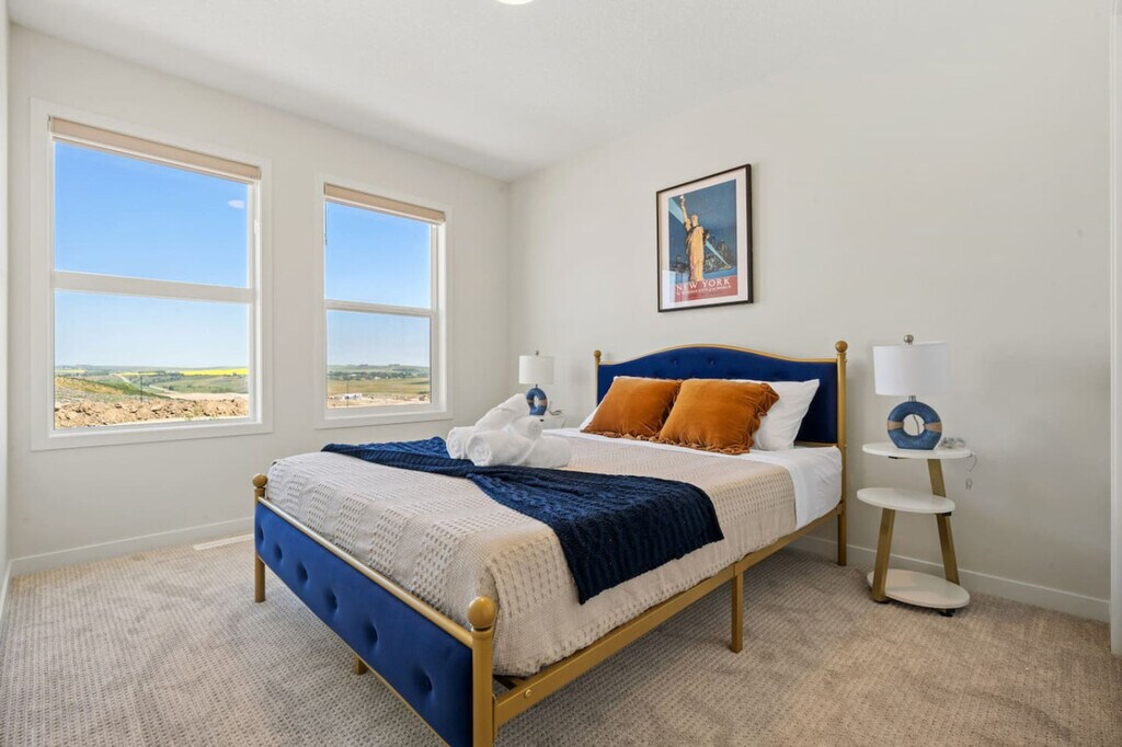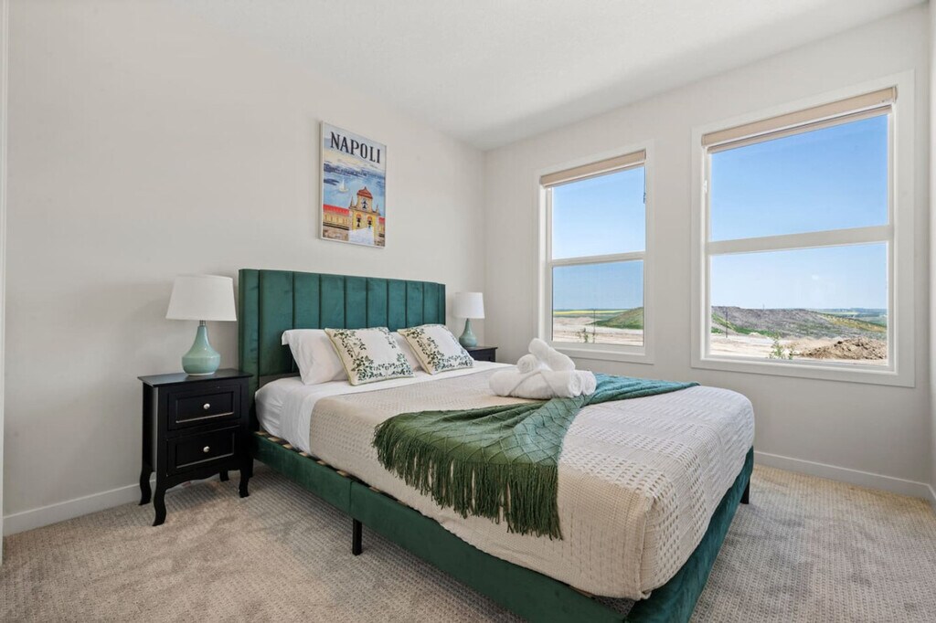 Welcome to a luxurious retreat in Glacier Ridge, nestled in a safe, family-friendly neighborhood just off Shaganappi Trail and minutes from the airport. This spacious home comfortably accommodates up to 14 guests, featuring four bedrooms with a king-size bed and three queen beds, along with four single bed cots. Enjoy the convenience of two fully stocked kitchens and two living rooms equipped with 58" and 50" smart TVs. Designed with comfort in mind, this home boasts two living rooms with comfortable sofas and smart TVs, perfect for relaxation. The kitchens are equipped with stainless steel and custom appliances, including two 4-burner stoves, ovens, microwaves, and a Keurig coffee maker. Enjoy meals in the large dining area on the main floor or the additional dining area in the basement. The property also includes central heating, portable AC, and in-unit washers and dryers. Enhance your stay with optional upgrades such as a National Park Entry, Welcome Basket, Birthday Decor Package, Romantic Wine and Flower Package, Spa at Home Package, Movie Night Upgrade, Christmas Tree and Decor, Halloween Decor and Pumpkin Carving Package, Winter Cozy Package, Beer Tasting Kit, Diffuser and Aroma Set, Additional Bedding and Sleeping Arrangements, Grocery Pre-Stocking Service, and Pet Friendly Package. These are subject to availability. Located in Glacier Ridge, this home offers easy access to Calgary Transit bus routes, providing convenient connections across the city. The neighborhood is developing with expanding pedestrian pathways, parks, and local amenities. Enjoy proximity to Glacier Ridge Playground, Stoney Trail, McDonald's, Tim Hortons, and various shopping centers. The property is also a short drive from Calgary International Airport, downtown Calgary, and popular attractions like Nose Hill Park and CrossIron Mills. Check-in and check-out are fully self-service, with detailed instructions provided for a seamless experience. The property has a strict no-smoking and no-parties policy, with a $250 CAD fine for smoking violations. Quiet hours are from 10 pm to 7 am, and noise should be kept under 85db. Unauthorized late check-out will result in additional fees. Guests are responsible for any damage to linens, towels, or equipment upon check-out, and excessive garbage disposal may incur additional charges. The property includes an office work area, making it ideal for remote work. High-speed WiFi is available throughout the home to ensure seamless connectivity. [SI]