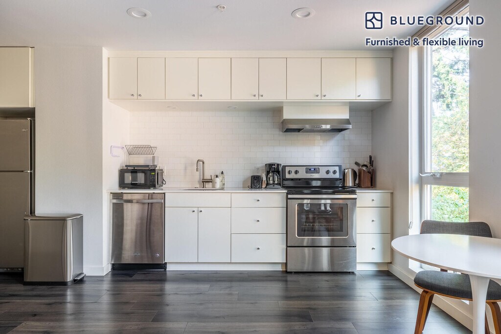 Discover the best of Portland, with this one bedroom apartment in Overlook. It’ll be easy to simply show up and start living in this contemporary furnished apartment with its fully equipped kitchen, sophisticated living room, and our dedicated, on-the-ground support. (ID #PDX10) The advertised rate of $1,450/month is the lowest available price, based on a 11 month(s) and 29 day(s) stay with a move-in date of February 5, 2026. Rates vary depending on the duration of stay, season, and other parameters. For exact pricing and additional pricing components, please visit our website and enter your desired move-in and move-out dates. The rate is applicable when billed upfront; it can be higher if billed in multiple payments. Brokers are welcome to reach out. Were you looking for an unfurnished lease? Try Blueground instead and upgrade from unfurnished to furnished living: - Furnished at rates comparable to unfurnished - No setup or furniture costs - save thousands - Move-in ready - save time, just bring your suitcase Designed with you in mind Thoughtfully designed with bespoke finishes, modern furnishings, and a fully equipped kitchen, you’ll enjoy that “I’m home” feeling with this Blueground apartment. Whether you’re lounging in your sophisticated living room streaming the latest and greatest entertainment on the smart TV or premium wireless speaker, or getting some well-earned rest on the superior quality mattress with luxury linens, you’ll fall in love with everything this Overlook apartment has to offer. This apartment also offers in-apartment laundry. Sleeping arrangements Queen Bed, 63in/160cm Amenities Building amenities unique to this one bedroom apartment include an on-site: - Dryer - Washing machine - Pets allowed Arrival and ongoing support The entire apartment is yours to enjoy! Throughout your stay, you’ll have access to our Client Experience team through the Blueground App. You can schedule additional cleanings, submit maintenance requests, and view our neighborhood recommendations with just a few taps. We’ll share all details upon confirmation of your stay. Ideally Located This furnished apartment is located in Overlook, just north of Portland across the Williamette River. In addition to local retailers, there are several popular restaurants in Overlook, including Fire on the Mountain Buffalo Wings. Looking for a fun night out? Be sure to visit the Alibi Tiki Lounge, a quirky karaoke bar. On days with nice weather, Overlook Park provides a green space to let your dog off leash or go for a family picnic. Thanks to its location, you can drive five minutes to downtown Portland, ride your bike, or take the MAX Yellow Line. Other things to note This Blueground apartment has flexible lease options, allowing you to book it for one month, a year, or more. Pets are welcome, though weight limits and breed restrictions apply and may incur fees. Please keep in mind that this is a walk up building. We take great pride in ensuring every photo displayed is shot in our own units with our actual furnishings. That said, we regularly refresh our decor and furniture arrangement, which may differ from what’s pictured. Also note - This apartment is located near a railway, so expect to hear moderate noise when trains pass - Ongoing construction in close proximity; construction sounds may occasionally be heard - There are stairs leading up to the entrance of this apartment, but no elevator