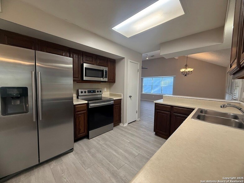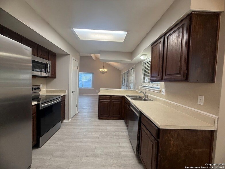Welcome to this bright and inviting 3 bedroom, 2.5 bath home tucked in a desirable NEISD community. Inside, you'll find soaring ceilings, large window seats, and abundant natural light that highlights the new luxury vinyl plank flooring and soft taupe paint tones throughout the downstairs. The main living area features a gas fireplace, perfect for cozy evenings, and flows easily into the dining and kitchen space. The kitchen comes equipped with a refrigerator, microwave, and stove/oven. A convenient half bath is located downstairs for guests. Upstairs, all bedrooms are thoughtfully arranged for privacy. The spacious primary suite offers a relaxing en-suite bathroom with a double vanity and a walk-in closet. Outside you will find and enjoy a large covered patio, mature shade trees, and a privacy fence-ideal for gatherings or quiet mornings outdoors. A roomy two-car garage completes the home. Pet-friendly and move-in ready, this property blends comfort, style, and convenience.