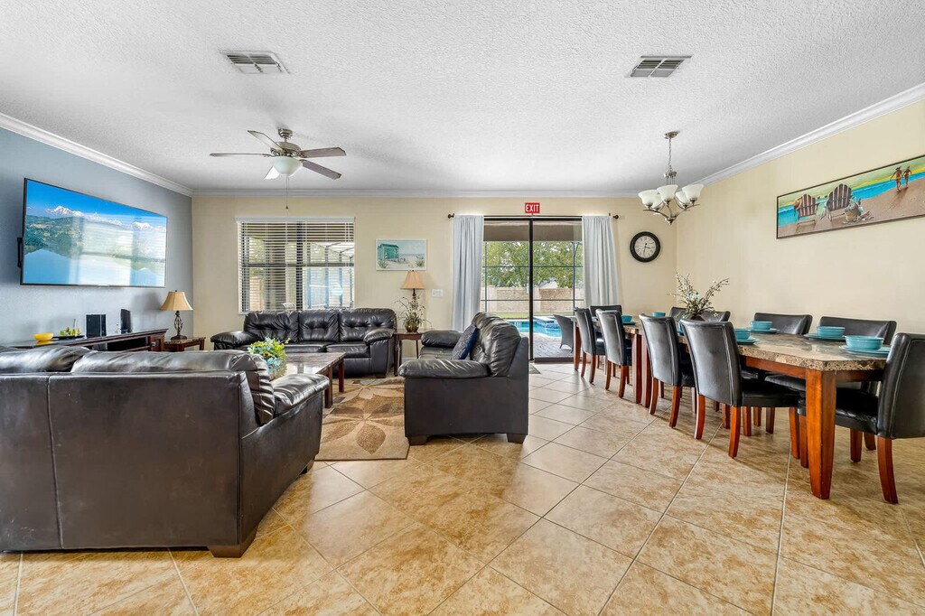 Leave everyday life behind and feel at home in this welcoming paradise designed for relaxation and family fun! Conveniently located just 20 minutes from Disney World, 28 minutes from Universal Studios, and 25 minutes from SeaWorld, this home offers the ideal balance of excitement and tranquility, close to the attractions, yet peaceful enough to truly relax. This home features expansive indoor and outdoor dining areas, a modern kitchen with stainless-steel appliances, and two comfortable living spaces, each with a flat-screen TV. Enjoy the private pool and hot tub with loungers, a game room complete with a pool table, and a complimentary washer and dryer. An electric vehicle charging station is also available. If you would like to add heating for the pool and spa, please request it at least one week in advance for $35 per day. Situated in ChampionsGate, FL, this gated master-planned community offers a perfect blend of luxury and recreation. Residents and visitors can enjoy championship golf courses, resort-style amenities, and convenient access to Orlando’s world-famous theme parks, including Disney World. Nearby Posner Park provides a variety of shopping and dining options, and easy access to I-4 and 27 makes getting around effortless. The check-out time is 10:00 AM. A written notification from the guest and approval by the host is required to welcome a house-trained dog (less than 50 lbs), and a pet fee is required. There is absolutely no smoking and no drugs allowed inside the home or elsewhere on the property. Only the number of guests indicated on the reservation are allowed to stay overnight on-premise, unless otherwise agreed upon in written form. The number of vehicles on the property should never exceed four per reservation. Please respect the neighborhood and neighbors, and be considerate while socializing outdoors after 10pm and before 8am. No fireworks of any kind are allowed. No firearms are allowed on the property, unless kept locked in a vehicle. The partner reserves the right to terminate a reservation without refund, and/or pursue monetary fines if guests are found to be in violation of any of these rules. Late check-outs may disrupt schedules and could result in a fee of up to $300. [SI]