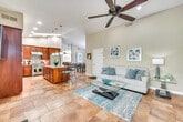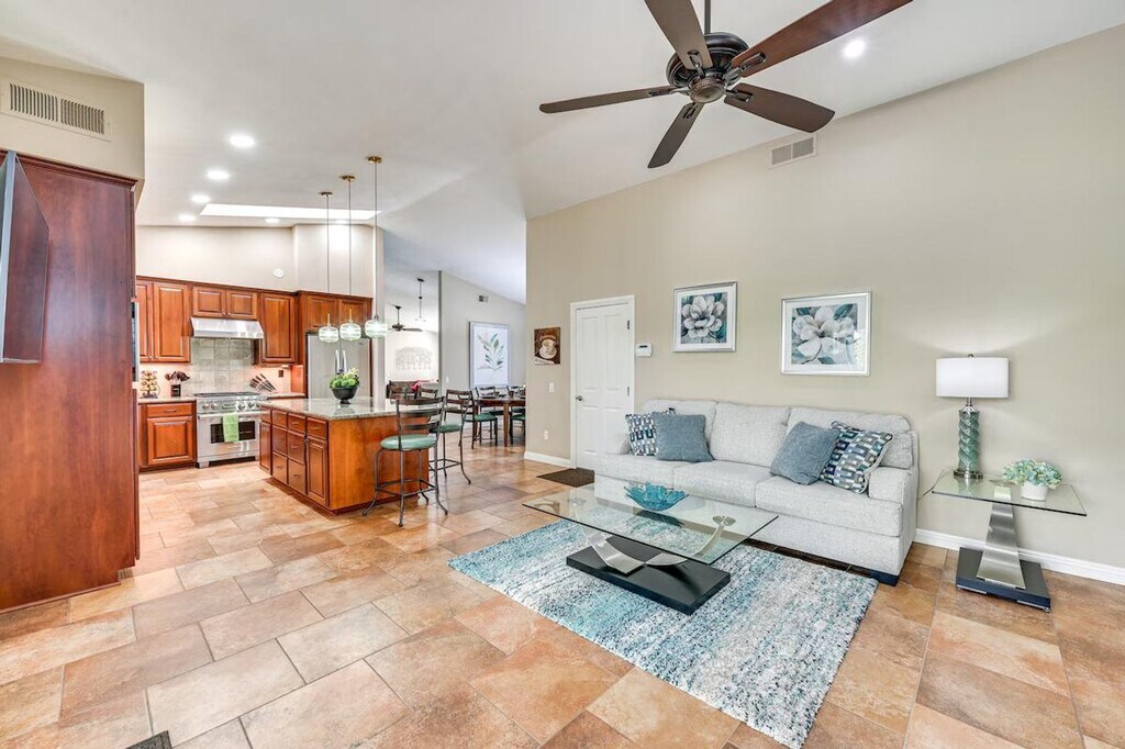 Feel at home in this stylish Chula Vista vacation rental, a single-story house requiring one step to access. This 5-bedroom, 3-bath house features a charming interior and a backyard complete with a personal putting green. This house features smart TVs with cable, a fireplace, a dining table, ceiling fans, and en-suite bathrooms with walk-in showers. The kitchen is equipped with a refrigerator, stove/oven, microwave, dishwasher, kitchen island, Nespresso coffee maker (pods provided), toaster, toaster oven, Crockpot, dishware and flatware, cooking basics, and spices. You'll also find a washer and dryer with laundry detergent, as well as trash bags, paper towels, towels, linens, complimentary toiletries, and a hair dryer. Enjoy the covered spa, outdoor fireplace, furnished patio and deck, outdoor dining set, and gas grill (gas line connection). Surrounded by top-rated parks, trails, and golf courses, this house is in a prime location for a memorable West Coast retreat. Catch a game at Petco Park or tour the San Diego Zoo. Quiet hours are observed from 10:00 PM to 9:00 AM. The property may not be suitable for young children due to the unfenced spa. There are six exterior security cameras facing out. No pets, events, parties, or large gatherings are allowed. - Guests will have access to the entire property via keyless entry [SI]