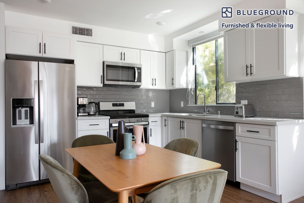 Show up and start living from day one in Los Angeles with this charming two bedroom Blueground apartment. You’ll love coming home to this thoughtfully furnished, beautifully designed, and fully equipped Mid-City home. (ID #LAX1121) The advertised rate of $3,560/month is the lowest available price, based on a 9 month(s) and 11 day(s) stay with a move-in date of March 3, 2026. Rates vary depending on the duration of stay, season, and other parameters. For exact pricing and additional pricing components, please visit our website and enter your desired move-in and move-out dates. The rate is applicable when billed upfront; it can be higher if billed in multiple payments. Brokers are welcome to reach out. Were you looking for an unfurnished lease? Try Blueground instead and upgrade from unfurnished to furnished living: - Furnished at rates comparable to unfurnished - No setup or furniture costs - save thousands - Move-in ready - save time, just bring your suitcase Designed with you in mind Thoughtfully designed with bespoke finishes, modern furnishings, and a fully equipped kitchen, you’ll enjoy that “I’m home” feeling with this Blueground apartment. Whether you’re lounging in your sophisticated living room streaming the latest and greatest entertainment on the smart TV or premium wireless speaker, or getting some well-earned rest on the superior quality mattress with luxury linens, you’ll fall in love with everything this Mid-City apartment has to offer. This apartment also offers in-apartment laundry. Sleeping arrangements King Bed, 70.8in/180cm King Bed, 70.8in/180cm Amenities Building amenities unique to this two bedroom apartment include an on-site: - BBQ Area - Dryer - Elevator - Washing machine - Parking - Pets allowed - Rooftop BBQ Arrival and ongoing support The entire apartment is yours to enjoy! Throughout your stay, you’ll have access to our Client Experience team through the Blueground App. You can schedule additional cleanings, submit maintenance requests, and view our neighborhood recommendations with just a few taps. We’ll share all details upon confirmation of your stay. Other things to note Building amenities may have an extra cost. This Blueground apartment has flexible lease options, allowing you to book it for one month, a year, or more. Pets are welcome, though weight limits and breed restrictions apply and may incur fees. Parking is offered based on availability and is subject to a fee. We take great pride in ensuring every photo displayed is shot in our own units with our actual furnishings. That said, we regularly refresh our decor and furniture arrangement, which may differ from what’s pictured.