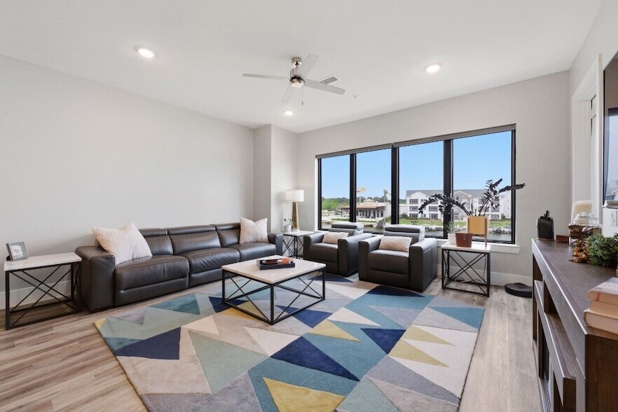 Location means a lot, and this is a prime location!! Enjoy elevated lakefront living in this tastefully designed 3-bedroom, 3-bath condo at The Shoreline at Waterpoint on Lake Conroe. This mid/high-rise residence features a modern look with soaring 9.5-foot ceilings, elegant neutral tones, and blackout curtains for a serene retreat. Step onto the private balcony, enhanced with a remote-controlled screen perfect for enjoying the breeze and watching boats drift by, bug-free. Community amenities include EV charging, garage parking, secure entry, two saltwater pools, and a hot tub. Walk to nearby dining, unwind with a massage, go for coffee, ice cream, or stop by CVS for a late-night snack or prescription. Medical and dental offices are conveniently located close by, too. It is all within walking distance, and you still have the privacy you are looking for. Experience low-maintenance luxury living with stunning views and everyday ease.