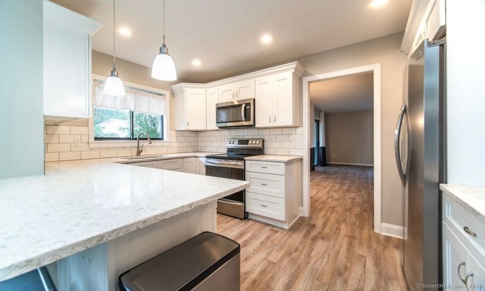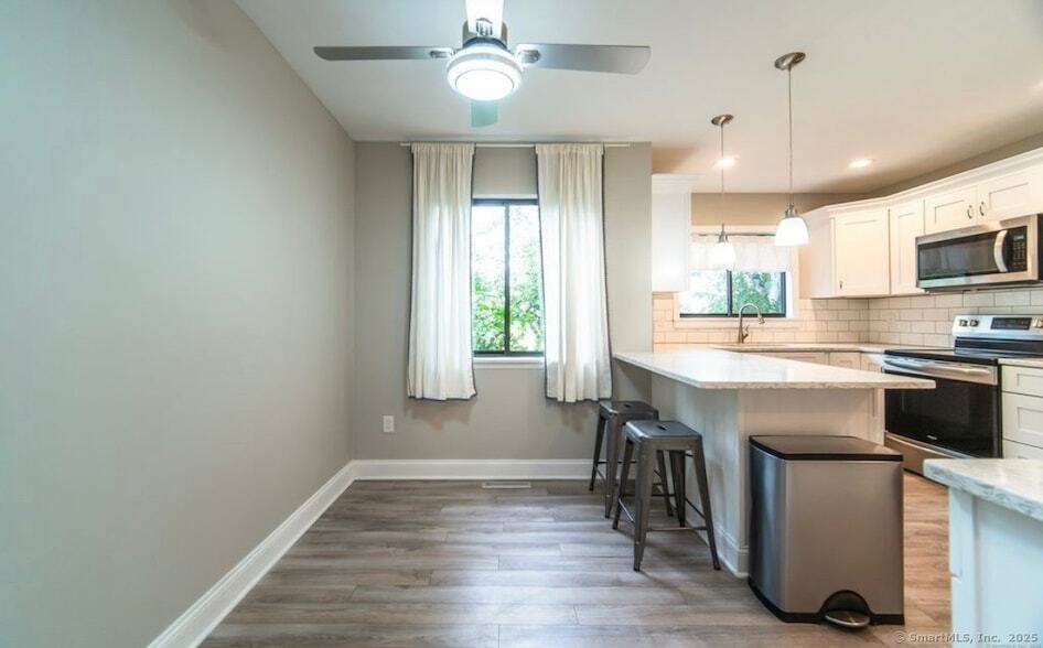 Experience stylish living in this beautifully updated condo, perfectly situated in one of Connecticut's most convenient locations. With three generous bedrooms, two full bathrooms, and an additional half bath, this condo blends comfort and functionality. The modern kitchen showcases quartz countertops, white shaker cabinets, and stainless steel appliances, opening seamlessly to the dining area and living room-ideal for entertaining or everyday living. Upstairs, the spacious primary bedroom features a renovated full bath, complemented by two additional bedrooms and a second updated full bath. A full walk-out basement provides endless options for storage, a home office, or a fitness area, while the two-car garage adds extra convenience. Residents enjoy quick access to shopping, dining, and entertainment-just 16 minutes from Hartford, 11 minutes from Blue Back Square, and 40 minutes from New Haven. The community itself offers attractive amenities including a sparkling pool, perfect for relaxing on warm summer days. Light, bright, and impeccably maintained, this condo delivers modern style, practical space, and a highly desirable location-ready for you to move in and enjoy.