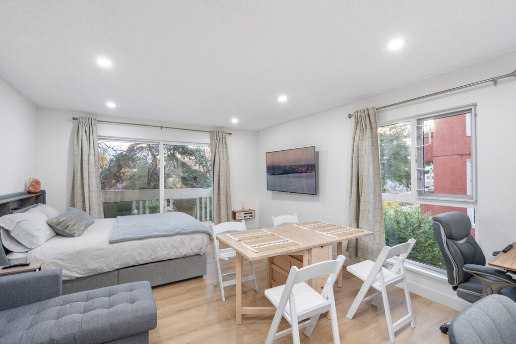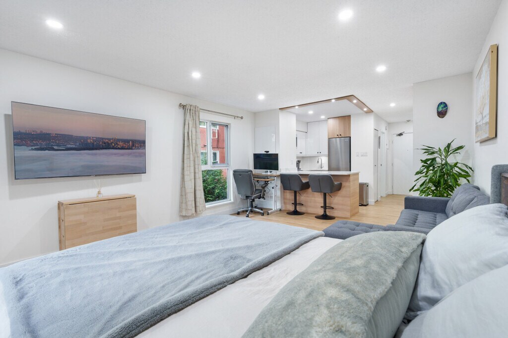 Experience a stylish and welcoming stay in this studio in East Vancouver, just a short walk to Commercial Drive’s best restaurants, cafés, and markets. Feel at home in this thoughtfully designed private space. This bright, open-concept studio features a comfortable queen bed, a cozy lounge area with a sofa and smart TV, and a modern full kitchen with stainless steel appliances and all essentials. The updated full bathroom includes a walk-in shower. Ample storage is provided with a large closet and dresser set-up. Enjoy views from the private balcony. One private parking stall is included. Shared paid laundry is available in the building. Located just steps from Commercial Drive, this home sits in one of East Vancouver’s most vibrant and walkable neighborhoods. The area is known for its independent cafés, global restaurants, boutique shops, local markets, and lively arts scene. Green parks, leafy residential streets, and community-oriented vibes make it an ideal base for both short and extended stays. Transit is convenient, with nearby bus routes connecting directly to Downtown, Main Street, and SkyTrain stations. Commercial–Broadway Station is within easy reach for rapid transit access citywide. The area is highly walkable and bike-friendly, with major roads like East 2nd Ave and Commercial Drive providing quick access for drivers. Vancouver International Airport (YVR) is a 22-minute drive, and Downtown Vancouver is an 8 to 9-minute drive. The nearest bus stop is a 5-minute walk, and the nearest grocery store is a 3 to 5-minute walk. No parties, events, or large gatherings are allowed. Smoking is prohibited in the unit or on the balcony. Guests are responsible for the cost of replacing any lost keys or garage remotes: Lost building key incurs a $50 replacement fee and a lost garage remote incurs a $75 replacement fee. Pets are allowed, with a maximum of 2, depending on size: a reasonable number of fish or other small aquarium animals, a reasonable number of small caged mammals, up to 2 caged birds, up to 1 dog, or up to 2 cats. Includes a spacious counter with dining stools for meals or remote work and a dedicated workspace with an ergonomic chair overlooking greenery. High-speed Wi-Fi is available for work and streaming. [SI]