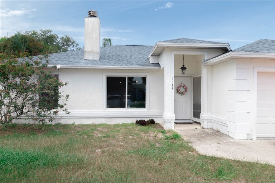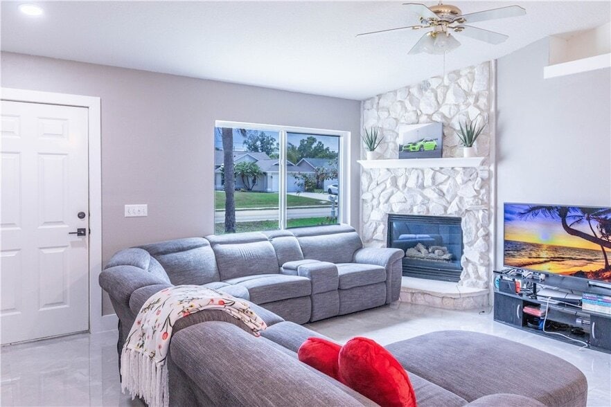 This home has been COMPLETELY RENOVATED with NEW tile throughout, a NEW roof )2023), and NEW AC unit 2023. The living room features a NEW impact window for added safety, as-well as a gas fireplace. NEW QUARTZ countertops in kitchen and bathrooms with the master bathroom receiving a tasteful renovation. This 18x18 outdoor patio with cement overhang. Quite and peaceful neighborhood with great schools nearby. The home is located only 6 miles away from the BEACH. You have plenty space to park your boat.
