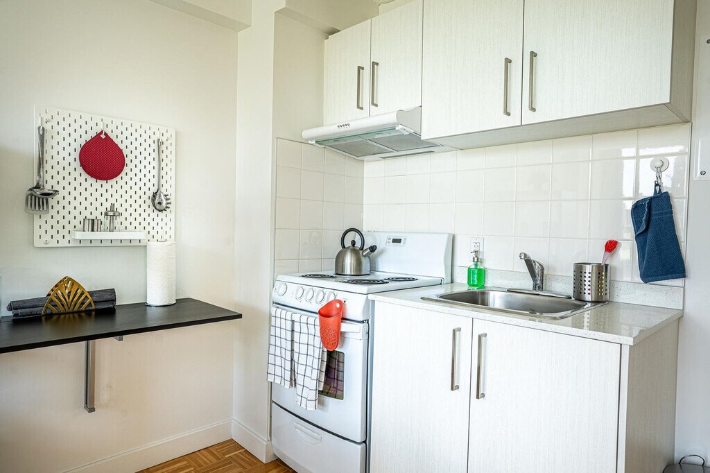 Discover urban tranquility at this beautifully designed apartment offering the perfect blend of comfort and sophistication. Step onto your private balcony and soak in panoramic views of Montreal's stunning skyline. With abundant natural light streaming through large windows, the interior feels open and welcoming. This thoughtfully furnished apartment includes a fully equipped kitchenette, a cozy dining area, and a serene sleeping space, ideal for both leisure and extended stays. The modern bathroom is complemented by ample storage, a dedicated workspace, and high-speed Wi-Fi, catering to business and lifestyle needs alike. Mid-stay cleaning is available for your convenience at a rate of $70 per hour. Lockers are available on demand for an additional charge of $30. Additional amenities available upon request include a first aid kit, espresso machine, hair dryer, reading lamps, iron and ironing board, extra pillows and blanket, storage space, and vacuum cleaner. Nestled in the heart of downtown Montreal, this apartment offers unbeatable proximity to the city’s finest attractions. Just steps away from the lively Sainte-Catherine Street, immerse yourself in a world of shopping, dining, and entertainment. The iconic Bell Centre and cultural treasures such as the Montreal Museum of Fine Arts are within walking distance. For students and professionals, this location is ideal, with esteemed institutions like McGill University and Concordia University nearby. Explore the vibrant neighborhoods of Old Montreal or unwind in the natural beauty of Mount Royal Park, all easily accessible with nearby public transit options. Cats are welcome upon request, but no other pets are allowed. Designated smoking areas are available outside the building, and smoking is not permitted inside the property. The indoor pool, terrace, gym, pool table, and co-working space are exclusively for the use of registered guests, and additional visitors are not permitted in these areas. The minimum age requirement to rent this property is 18 years old. Upon booking confirmation, a pre-check-in form will be required to confirm your identity and arrival details. This property is equipped with 24-hour security. Includes a dedicated workspace and high-speed Wi-Fi for work and leisure. A laptop computer is not included. [SI]