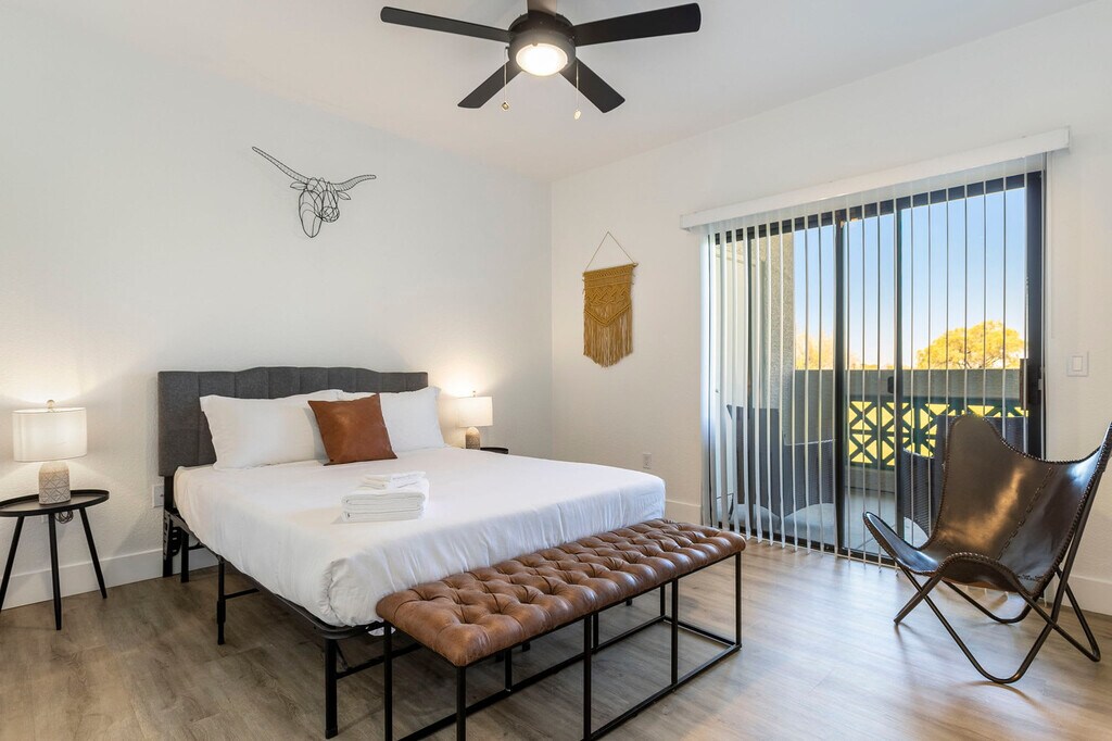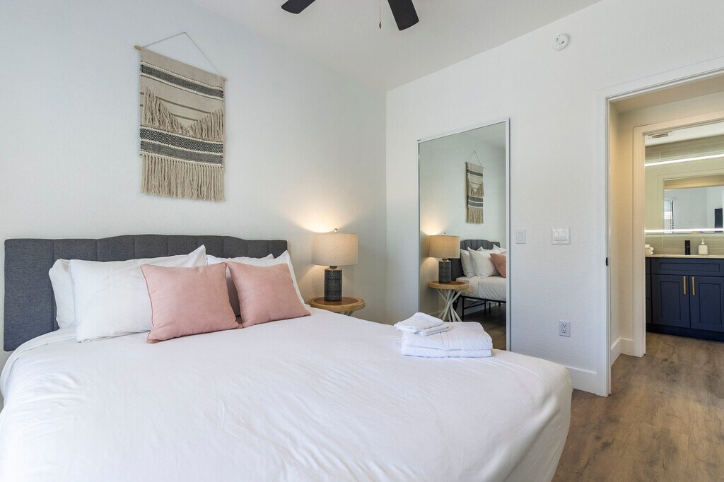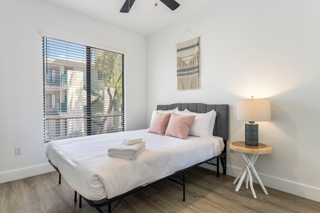 Feel at home in this newly built condo in Scottsdale, steps away from shopping, dining, and entertainment, and overlooking the Westin Kierland Golf Course. Note that this is a garden-style unit that requires climbing one to two flights of stairs. This condo is suitable for a family, group of friends, or business travelers and has all the amenities necessary to enjoy your stay. It features quartz countertops, stainless steel appliances, a fully equipped kitchen, a washer and dryer, complimentary coffee, modern decor, a Smart-TV with streaming apps installed, and 100mbps+ internet. Enjoy access to the luxury fitness center, pool with spa cabanas and fire pits, jacuzzi, and lounge and game room with pool table. Pool access is subject to season and weather. Pets are welcome with a fee of $100-300 based on stay length. All pets must be on a leash when outside on the property. Located in Kierland Commons, this apartment is close to world-class golf courses, hiking trails, and spas. You can enjoy the best of Scottsdale and is just a short drive away from everything and is even walkable to Kierland Commons. Smoking of any kind is not permitted within or outside of this apartment, including balconies, patios, or common and/or parking areas. Any sign of smoking is a violation of the stay agreement, which may result in immediate termination and recovery fees beginning at $500. There is a $200 penalty for removing smoke detectors and a $200 penalty for lost key fobs. No outside guests are allowed without permission. Guests must agree to not disturb neighbors at all times during the stay and must observe quiet hours from 9pm-8am each day. The home is proactively monitored with decibel sensors for compliance with this noise policy. Check-in is at 4 PM and check-out is at 11 AM, with a $75/hr late fee. [SI]