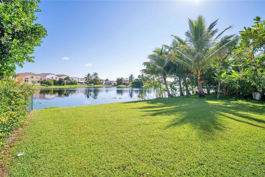 Highly Desirable Waterfront Home with High Ceilings and Large Lake View Front. Living room separate from Formal Dining room. Spacious Kitchen with Cooking Island. Additional Dining area by the Kitchen Facing the beautiful Lake. Large 1st Floor Bedroom. Full size Washer & Dryer, 2 Car garage. Very large Master Bedroom with Walk in closet. Separate Family room. Gated Community with 4 community pools, The larger Olympic size pool is by the community School. And for your personal and family fitness: Basketball Court, Baseball fields, Tennis Court, Kids playground, Barbeque area. Excellent location, just West of I-75. Close to Costco, Whole Foods and more. No Pets.