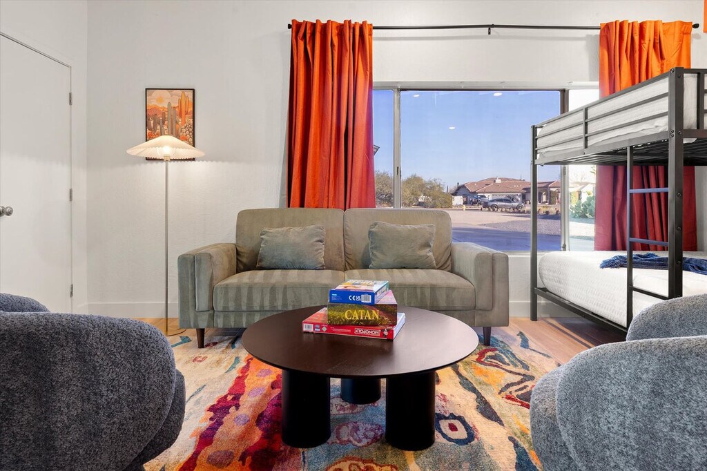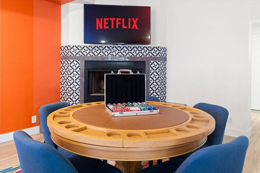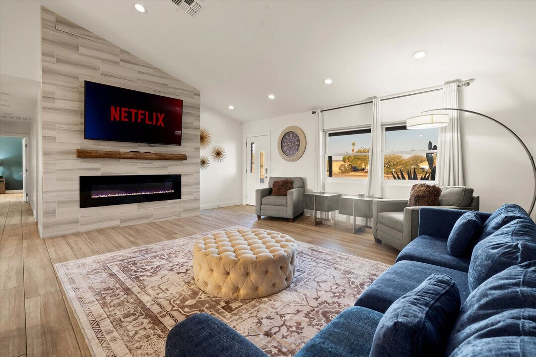 Feel at home in this 5-bedroom Phoenix getaway, a stunning retreat designed for luxury, entertainment, and relaxation. Accommodating up to 20 guests, this home includes a 4-bedroom, 2-bath main house and a private 1-bedroom, 1-bath casita, offering the perfect blend of space and privacy. This home features a fully stocked chef’s kitchen with high-end stainless appliances, ample cabinetry, and a large island with high seating, as well as a drip and Keurig coffee maker. The living room includes a 70" smart TV and a large plush sofa. Enjoy the insane private backyard resort, complete with a heated pool with a rock waterfall and slide, an in-ground spa, pickleball and basketball courts, a mini turf soccer field, a 9-hole putt-putt, snookball, a playground, an outdoor kitchen with a TV, a fire pit, a BBQ grill, cornhole, and poolside loungers. For families with young children, a removable pool fence is provided. The heated pool is available for $125 per night and must be heated for the entirety of your stay. Up to 2 dogs are allowed for $125 per stay. Located in the heart of Phoenix, this home is just minutes from top dining, shopping, hiking trails, and golf courses, making it the perfect getaway for families and groups looking to experience the best of the Valley of the Sun. Nearby attractions include the Musical Instrument Museum, the Desert Botanical Garden, Papago Park, Camelback Mountain, and the Phoenix Zoo. Explore local restaurants such as The Sicilian Butcher, Original Breakfast House, Little Miss BBQ, Rusconi's American Kitchen, and Cocina Madrigal. Renting a car is a convenient option to explore the area, or use rideshare services like Uber and Lyft. Check-in is at 4pm and check-out is at 10am. No cats are allowed. Guests must be 25 years or older to book this property. No parties are allowed—violations may result in immediate termination of the stay. An exterior camera is installed solely to monitor the cleaning team for quality and security purposes. Parking is available in the driveway for 4 cars max. The pool and the spa cannot be heated simultaneously. Registration Number: STR-2025-001430 [SI]
