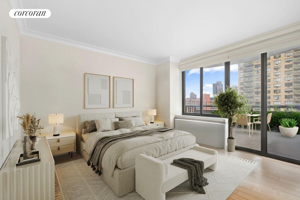 This luxurious and sundrenched, corner 2 bedroom/2 bath with in-unit washer/dryer has recently been updated with fresh new paint and re-sanded hardwood Oak flooring.This corner apartment comes with a large balcony and boasts of natural light with South and East exposures and unobstructed city views. The pass-through kitchen is windowed, featuring high-end stainless-steel appliances, including full-sized appliances, a Miele gas cooktop and dishwasher, Subzero refrigerator, GE microwave and granite countertop. For your convenience there is a full sized in-unit stackable washer/dryer. The split layout allows ultimate privacy with generously sized bedrooms and two full baths, including a Toto Bidet toilet. There is ample closet space throughout. There is board approval involved. Sorry no pets.The L'Isola condominium is conveniently located in Kips Bay, just a short walk to the 6 train, Grand Central for 4/5/6/7/S trains, East River Ferry, Trader Joe's, Whole Foods Equinox gym, Theater, great restaurants, nightlife and coffee shops. Building amenities include:- 24-hour doorman- Live-in super- Fitness center with Sauna- Landscaped garden with barbeque grill- Welcoming courtyard with a water fountainPictures are virtually staged.