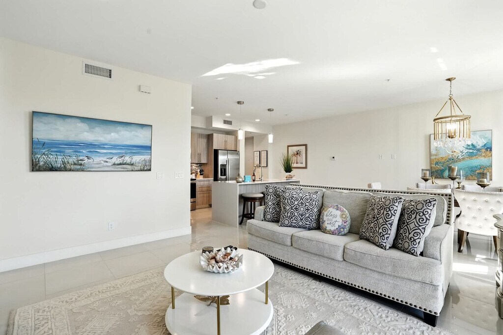 Welcome to your perfect seasonal oasis in the gated Majestic Palms community. Just 4 miles from Margaritaville and Fort Myers Beach, this stylish 3-bedroom, 2-bath condo blends modern comforts with resort-style amenities. With tall ceilings, a split-bedroom floor plan, and a screened lanai for morning coffee or evening sunsets, this retreat is designed for both relaxation and convenience. Step into your coastal retreat near Fort Myers Beach, where the open living room features a sofa, loveseat, coffee table, and large flat-screen TV. The dining table seats six, with three additional barstools at the kitchen island. The gourmet kitchen boasts a waterfall-edge island with a sink and dishwasher, stainless steel appliances, and sleek cabinetry. A full laundry room is conveniently located near the entry. The screened lanai offers two seating areas for relaxing or dining al fresco, and one covered parking space is included. Community amenities include a heated pool and spa with a sun deck and lounge chairs, a fitness center, and a community lounge on the first floor. Enjoy the outdoor BBQ area and shaded seating overlooking a tranquil pond. Perfect for snowbirds, extended-stay guests, or families looking for a clean, modern home base near the beach. Spend mornings at the pool, afternoons at Fort Myers Beach, and evenings dining at nearby restaurants—all just minutes away. This is a self check-in property. You will receive the codes to check in once we have received the full payment and HOA approval has been received. Quiet hours are between 22:00 and 8:00. Registration Number: Florida state permit number: #CND2103205 [SI]