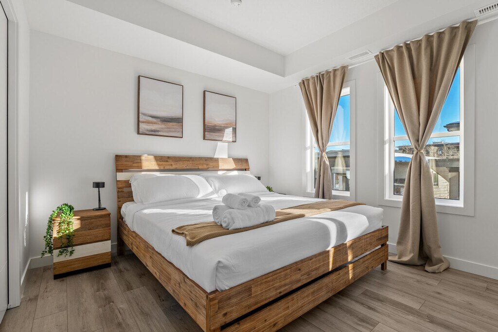 Minutes away from Winsport Olympic Park, this private townhouse offers a cozy getaway for executives, couples, small gatherings of friends, or new families. Feel at home with features like garage parking, a dedicated workspace, a dining table for six, a large closet, and a balcony with an outdoor dining set. The townhouse includes a king-size bed and a queen sofa bed, a 65" smart TV with Netflix, and an in-unit washer and dryer. The townhouse is designed with a modern and inviting mood, featuring a fully equipped kitchen with stainless steel and custom appliances, a 4-burner stove, oven, microwave, refrigerator, freezer, and dishwasher with pods provided. Enjoy complimentary drinks like tea and coffee, and take advantage of the Keurig coffee maker, toaster, blender, and other essentials. The dining area includes a large table on the main floor with island seating and bar stools. Optional upgrades include a National Park Entry Upgrade, Welcome Basket, Birthday Decor Package, Romantic Wine and Flower Package, Spa at Home Package, Movie Night Upgrade, Christmas Tree and Decor, Halloween Decor and Pumpkin Carving Package, Winter Cozy Package, Beer Tasting Kit, Diffuser and Aroma Set, Additional Bedding and Sleeping Arrangements, Grocery Pre-Stocking Service, and a Pet Friendly Package. Subject to availability. Located in a transit-friendly area, Calgary Transit operates several bus routes servicing the Aspen Spring area, providing convenient connections to various parts of the city. The neighborhood is designed for a walkable lifestyle with picturesque recreational areas and abundant walking trails. It's also bike-friendly, bordered by a serene natural reserve with extensive walking trails and bike paths. Quick access to major roads like Stoney Trail and Sarcee Trail makes travel around Calgary and beyond a breeze. The property is professionally managed to ensure top-tier service and a smooth stay. It includes full self check-in and check-out, with detailed instructions provided. A $250 CAD fine will be charged if smoking is detected, following local laws and fine policies. Quiet hours are from 10 pm to 7 am, and noise should be kept under 85db. No parties, drugs, excessive drinking, or loud music are allowed. Events for work or meetings are allowed upon request. Unauthorized late check-out will result in an extra night stay or additional fees. Be mindful of locking bathroom doors from the outside, as locksmith costs will be the responsibility of the guest. The townhouse features a dedicated workspace with high-speed internet, making it remote work-friendly. [SI]