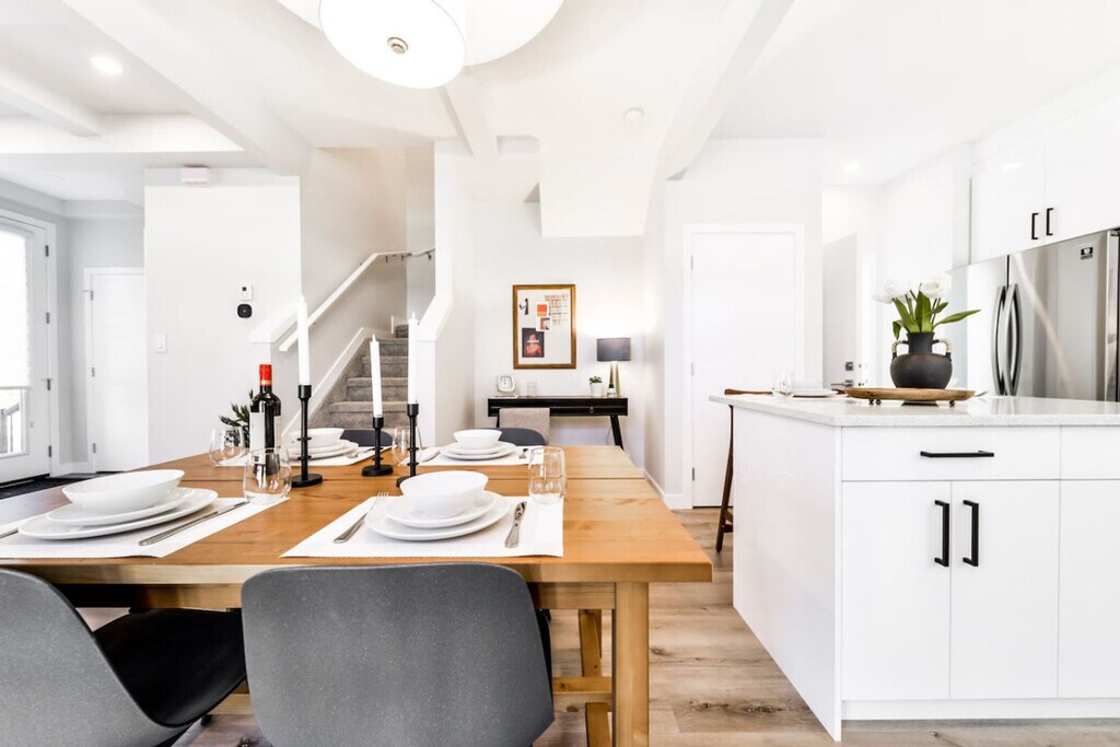 Imagine relaxing with your whole family in a beautiful home just minutes from the famous West Edmonton Mall. This brand new and spacious 3-bedroom, 2.5-bath home offers a perfect retreat for families, with easy access to Downtown, the University, and the mall. Enjoy the convenience of garage parking and a child-friendly space, making it ideal for longer stays. Inside the home, you can unwind by watching your favorite shows on ROKU TV or entertain friends and family with ample space both indoors and out. The fully equipped kitchen comes with brand new stainless steel appliances, including a microwave, fridge, stove, and dishwasher, along with all the necessary utensils and cookware. Enjoy the comfort of a king-size bed with an ensuite, a queen bed, and a bunk bed, all complete with fresh sheets. For those seeking more privacy, a privacy upgrade is available at an additional cost, which blocks off the entire home and ensures no guests will be booked below during your stay. Early check-in or late check-out is available for a fee of $30 each or $50 for both, with prior approval. The Glenwood neighborhood in Edmonton, Alberta, is a vibrant and diverse community located in the northwest part of the city. With the nearby River Valley offering hiking, biking, and fishing, and several beautiful parks like Kinnaird Park, there's plenty to explore. West Edmonton Mall, one of North America's largest malls, is just a short drive away, along with local shopping centers and restaurants offering a range of cuisines. This is the main floor of the home only, and the basement is a separate listing. Quiet hours are between 10 PM and 8 AM to respect neighbors. No pets are allowed, and this is a non-party home. A $250 fee will be charged if smoking occurs inside the property, and tampering with safety devices will incur a minimum $100 fee. The maximum occupancy is 6 people, and any additional guests will incur a $40 fee per person per night. Late check-out beyond 30 minutes will incur a $50 fee, and more than 2 hours late will result in an additional day's charge. The home is remote work-friendly with fast Wi-Fi, allowing you to work from home comfortably. A laptop computer is not included. Registration Number: 450541086-002 [SI]