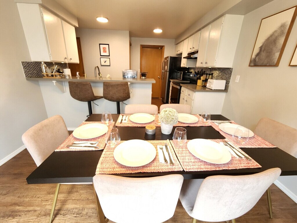 The advertised rate of $5,664/month is the lowest available price, based on a 1 month(s) stay with a move-in date of April 29, 2026. Rates vary depending on the duration of stay, season, and other parameters. For exact pricing and additional pricing components, please visit our website and enter your desired move-in and move-out dates. The rate is applicable when billed upfront; it can be higher if billed in multiple payments. Feel at home in this spacious home with all brand new, stylish, and comfortable modern furniture in a 2-unit townhouse. This home features a fully equipped kitchen with a Keurig, blender, mixer, and other appliances. Entertainment is provided by a 65" smart TV in the living room, and each room has its own TV, providing access to your Netflix, Amazon, HBO, and Disney accounts. For your comfort, there are portable ACs in each bedroom and the living room, as well as a brand new washer and dryer. Two parking spots are available, and there is a fully fenced yard. Located just 3 miles from Alderwood Mall, home to 157 stores and Daiso's first US store, this home is also only 10 minutes from Mukilteo and Edmonds waterfronts and ferries. Quiet hours are after 9pm and before 8am. Smoking is prohibited, and a $150 smoke remediation fee will be charged if evidence of smoking is found. Parties are prohibited, and if there is a party, there will be immediate cancellation of the reservation plus a $300 penalty fee. Pets are not allowed, and if evidence of a pet is found, there will be an extra $150 cleaning fee plus a $150 penalty. No unapproved guests are allowed. [SI]
