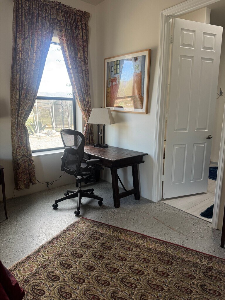 Property Id: 2342353 550 sqft studio Has independent entrance is located in 5 acres ranch. It has a kitchenette with dishes utensils, refrigerator, microwave, toaster, coffee maker and boiler. The bathroom has jacuzzi tub, shower. The walking closet has ample shelves and space for storage. The room is furnished with queen size bed, tv, desk, pull-up couch,…and equipped with central heat and air conditioner. The private entrance is from covered patio that is furnished by table and chairs. There is a pool and laundry facility for use.