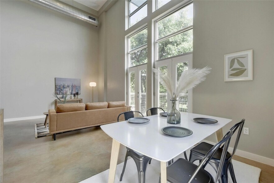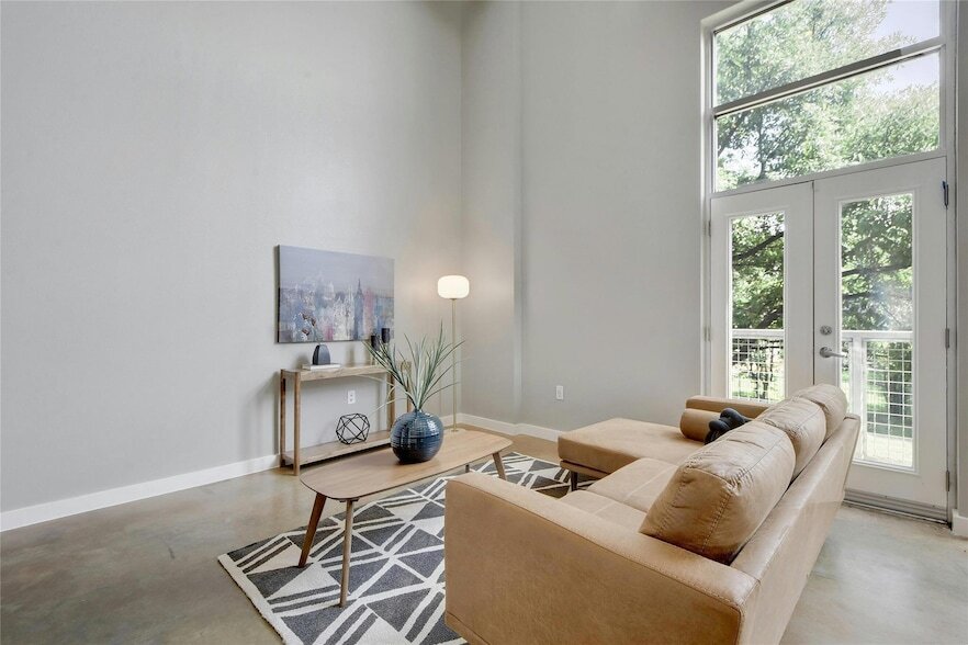 Welcome to contemporary urban living at its finest in this sleek 2-bedroom, 1-bathroom condo in vibrant East Austin. Situated just minutes from Downtown, Rainey Street, Lady Bird Lake, UT, South Congress, ABIA, and more, this prime location offers unparalleled access to all that Austin has to offer. Step inside to discover a spacious open-concept floorplan with soaring ceilings, lots of windows, exposed ductwork, neutral walls, and beautiful stained concrete flooring, creating a modern and inviting atmosphere throughout. Fridge, washer and dryer included (not pictured but present). The living and dining areas seamlessly connect to the kitchen, featuring a center island, breakfast bar, granite countertops, ample storage, and sleek stainless-steel appliances, including a gas range, providing the perfect space for entertaining guests and culinary creativity. The main-floor primary bedroom boasts ample closet space and an en-suite bathroom with a granite-topped vanity, offering both comfort and convenience. Plus, the connected laundry room adds an extra layer of functionality to the primary bedroom suite. Take the stairs up to the loft bedroom, a versatile space with a wall of custom built-ins, ideal for a bedroom, home office, or additional living area, offering endless possibilities to suit your lifestyle needs. Cycling enthusiasts can safely store bicycles with ease using the four elevated bike racks, securely suspended from the loft ceiling, providing a space-saving and convenient solution for bike storage. Outside, residents can enjoy the rooftop gathering area in addition to a dog park, perfect for socializing with neighbors. With its unbeatable location and modern amenities, this condo offers the epitome of urban living, where residents can immerse themselves in the vibrant East Austin lifestyle, with easy access to dining, entertainment, outdoor recreation, and cultural attractions. Schedule a showing today!