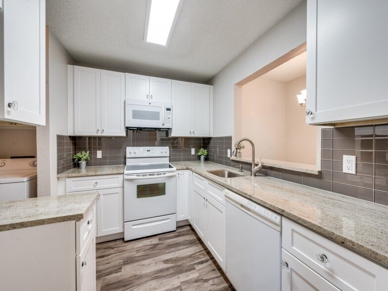 Welcome to the recently updated and beautifully appointed first floor condo home. Solid flooring all the living and high traffic areas and carpet in the bedrooms for comfort and relaxing. Enter to the open light and bright Living area with wonderful laminate wood-like flooring and stunning fireplace which includes tile accents and a wide mantel. To the side is your kitchen showcasing plenty of storage, ample counter space, and white appliances. From the kitchen there is a large pass-through window, great for entertaining, to your dining area. The dining area overlooks the covered back patio great for enjoying the morning breeze or evening sounds. Both bedrooms are well-sized and have access to individual sinks. No fighting over mirror time! Take a moment to notice all the updated details throughout. This home has been thoughtfully prepared for your move-in. Located within short distances to all the necessary and desired eateries, entertainment, and shopping. Don't forget the community pool for the warm Texas days. Washer, Dryer and Refrigerator included.
