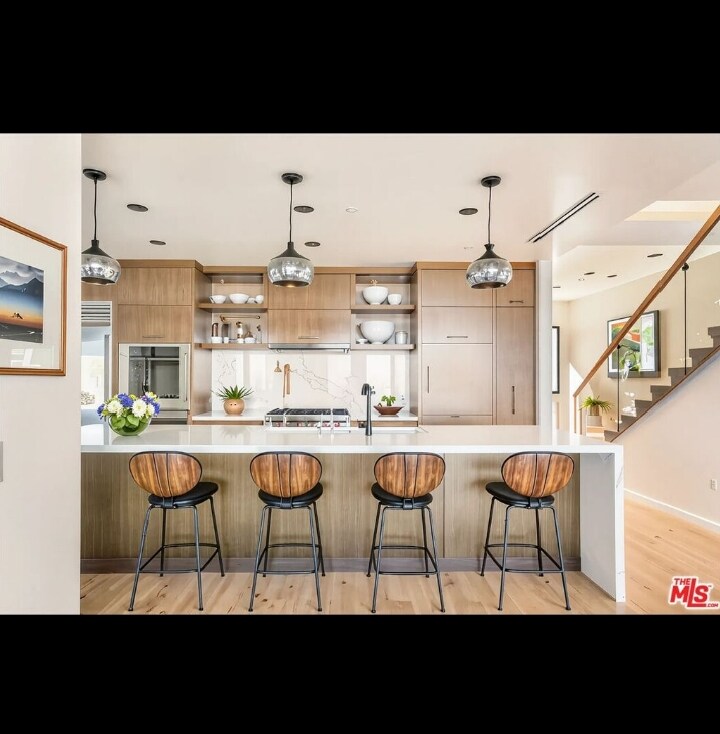 Property Id: 2281780 Set above the city in the Hollywood Hills, 1610 Viewmont has been completely transformed by the Belwood development team into a refined modern estate defined by clean lines, expansive volumes, and walls of glass. Spanning three levels, the home embraces its panoramic setting with unobstructed views from nearly every room and seamless indoor-outdoor transitions. A dramatic double-height entry leads into an open-concept main level where natural light floods the living spaces. The living room, anchored by a sleek fireplace, opens to generous view terraces, while the adjacent kitchen impresses with a marble island, custom cabinetry, and top-tier appliances. Five bedrooms are positioned throughout, including a main-level guest suite, upstairs bedrooms, and a private rooftop-level suite. The primary is a true retreat with fireplace, spa-like bath, and fully outfitted walk-in closet. Above it all, a full-scale rooftop deck with stainless steel outdoor kitchen captures sweeping skyline views, ideal for entertaining or quiet evenings. Just minutes from the Sunset Strip yet entirely private, 1610 Viewmont delivers elevated hillside living at its finest. Inquire about pets.