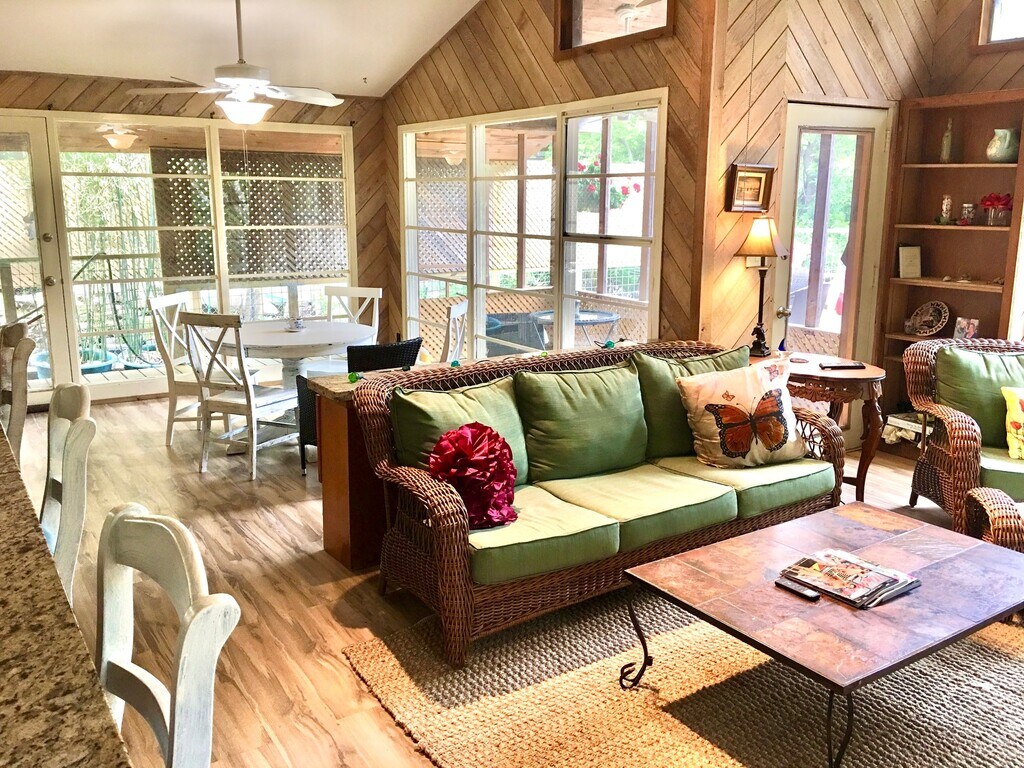 Property Id: 2494492 Welcome to your private retreat on Lake Travis. This unique home sits on the side of a hill, surrounded by mature trees giving it a true "treehouse" feel, with the deck nestled up in the canopy and views of the Hill Country. The back of the home is level with the street for easy access, while the living space extends outward into a peaceful, elevated, wooded setting. Built using reclaimed materials from the mid 70's University of Texas, the home features distinctive touches like repurposed classroom windows, a converted telephone booth pantry, and a custom bar (previously part of UT Law Library) with granite overlay. Home Features: Flexible 1 bedroom (11 x 13.5) open or enclosed for privacy 1 bathroom with granite countertop, mosaic tile flooring, bathtub Open living, dining, and kitchen with vaulted ceiling & natural light Kitchen with granite counters, long bar, pantry, small dishwasher, washer/dryer Artistic, custom details throughout Outdoor Living: Elevated deck among trees