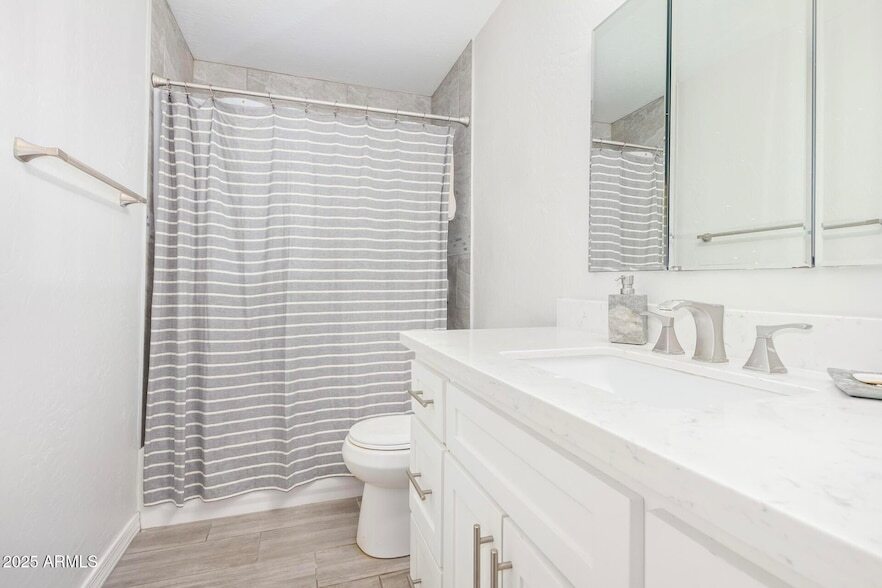 NO HOA! Available now! This recently updated 2-bedroom, 1-bathroom duplex unit offers a bright and modern living space in a prime Phoenix location just minutes from shopping, dining, schools, and freeway access.Step inside to find fresh paint, beautiful wood-look flooring throughout, and a stylish galley kitchen featuring white shaker cabinets, quartz countertops, stainless steel appliances, mosaic tile backsplash, and sleek track lighting. The open living and dining area brings in great natural light, creating a warm and welcoming vibe.