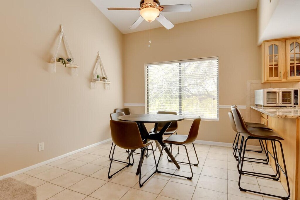 Feel at home in this 2-bedroom, 2-bath vacation rental in Fountain Hills, Arizona. Start your day with quiet mornings on the balcony, enjoying a mountain view. Please note that a staircase is required to access the apartment. This condo has everything you’ll need for a getaway, including central air conditioning, electric heating, and a furnished balcony. Inside, you'll find 3 Smart TVs, books, ceiling fans, and board games. The kitchen is fully equipped with a fridge, stove and oven, dishwasher, cooking basics, dishware and flatware, microwave, toaster, 2-in-1 toaster oven and air fryer, Crockpot, single-serve coffee maker, ice maker, trash bags, and paper towels. You'll also have access to free Wi-Fi, a washer and dryer, towels and linens, hangers, an iron and ironing board, and a clothes steamer. Enjoy access to the community's heated outdoor pool and hot tub. A charcoal grill is available for use; please bring your own charcoal. Parking is available in the driveway for one vehicle, with free street parking also available. Garage access is not included. You'll be within walking distance to grocery stores and dining, with Fountain Park a mere mile away. Camelback Mountain, Butterfly Wonderland, and Old Town Scottsdale are also great options for city and outdoor variety. Quiet hours are observed from 9:00 PM to 7:00 AM. This is a non-smoking property, and pets, events, parties, and large gatherings are not allowed. Your safety matters. This property features 1 exterior security camera at the front door, facing the entryway. It does not look into any interior spaces. The camera records video and sound when activated by motion. [SI]