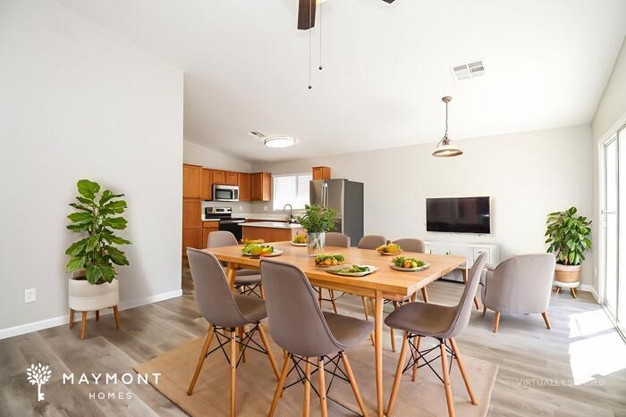 MOVE-IN READY This home is move-in ready. Schedule your tour now or start your application today. Monthly Recurring Fees: $20.00 - Smart Home $10.95 - Utility Management Maymont Homes is committed to clear and upfront pricing. In addition to the advertised rent, residents may have monthly fees, including a $10.95 utility management fee, a $25.00 wastewater fee for homes on septic systems, and an amenity fee for homes with smart home technology, valet trash, or other community amenities. This does not include utilities or optional fees, including but not limited to pet fees and renter’s insurance. Welcome to this inviting 3-bedroom, 2-bathroom single-story home in Buckeye, AZ, offering comfort, convenience, and style. Located near the Gila River, close to scenic parks, and just minutes from I-10, this home provides easy access to everything the West Valley has to offer. Featuring a tile roof and a two-car garage, this home blends classic Arizona charm with everyday practicality. Step inside to find luxury vinyl plank flooring and vaulted ceilings that enhance the open, airy feel. The cozy living room provides a welcoming space to relax and unwind. The spacious kitchen is ideal for both daily living and entertaining, complete with a center island, oak cabinetry, quartz countertops, matching stainless steel appliances, and a window over the sink that fills the space with natural light. A breakfast nook offers the perfect spot to enjoy morning coffee, while sliding glass doors lead to a large backyard that’s ready for your personal touch. Each bedroom is generously sized, and both bathrooms feature vanities with quartz countertops for a clean, modern finish. The expansive backyard provides plenty of room for outdoor enjoyment, whether you’re hosting or relaxing under the Arizona sky. Don’t miss your chance to call this Buckeye home your own. Apply today. *Maymont Homes provides residents with convenient solutions, including simplified utility billing, a flexible rent payment option, and an affordable security deposit alternative. Visit our website or contact us for more details. This information is deemed reliable, but not guaranteed. All measurements are approximate. Actual product and home specifications may vary in dimension or detail. Images are for representational purposes only. Some programs and services may not be available in all market areas. Prices and availability are subject to change without notice. Advertised rent prices do not include the required application fee, the partially refundable reservation fee (due upon application approval), or the mandatory monthly utility management fee (in select market areas.) Residents must maintain renters insurance as specified in their lease. If third-party renters insurance is not provided, residents will be automatically enrolled in our Master Insurance Policy for a fee. Select homes may be located in communities that require a monthly fee for community-specific amenities or services. For complete details, please contact a company leasing representative. Equal Housing Opportunity. Estimated availability date is subject to change based on construction timelines and move-out confirmation. This property allows self guided viewing without an appointment. Contact for details.