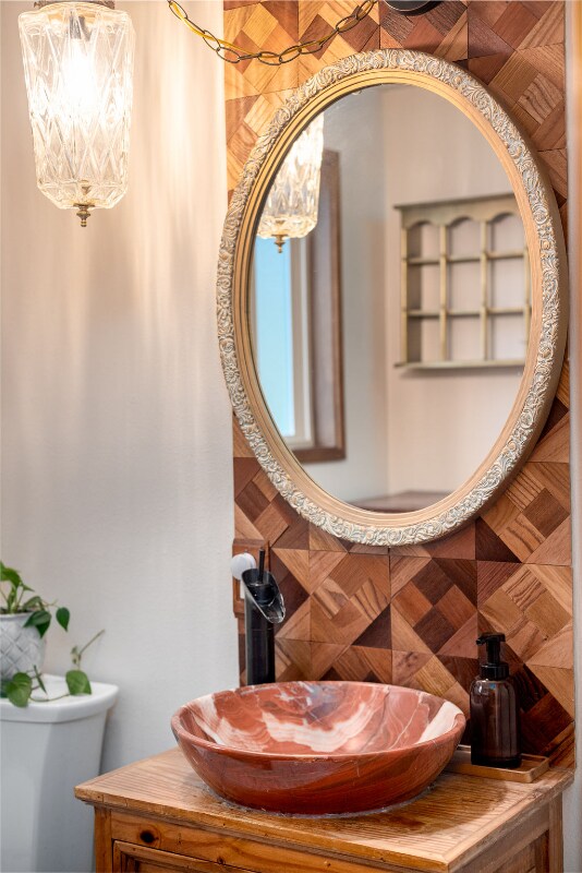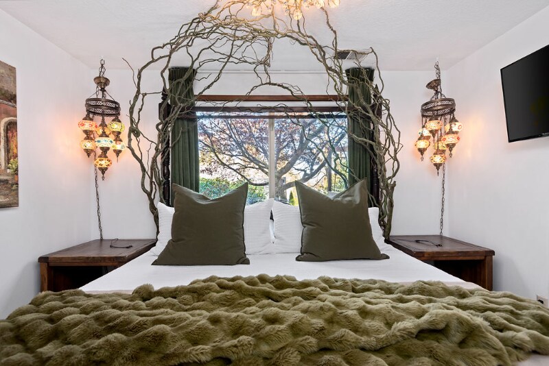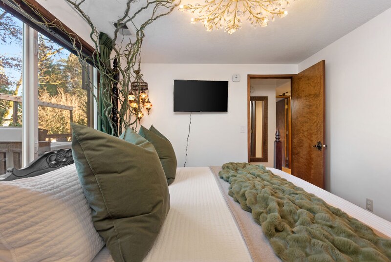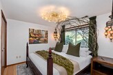 Property Id: 2342399 The Space Step out of the mundane world and into the magic of Feyre's Hollow. Designed for dreamers, romantics, and lovers of high fantasy, this whimsical sanctuary offers an escape into a storybook setting. Whether you are retreating to read your favorite novel or celebrating a special occasion, the Hallow awaits. The Magic Inside: The Enchanted Bedroom: Sleep beneath a dramatic canopy of twisted branches and vines, illuminated by a crystal chandelier and the warm amber glow of hanging Moroccan mosaic lamps. The plush bedding and moss-green accents make it feel like a royal chamber in the Spring Court. The Living Sanctuary: Relax on the leather sofa surrounding a stunning live-edge burl wood coffee table. The living space features a unique curated alcove, bamboo textures, and sliding doors that let the natural light pour in. Spa-Inspired Bath: A rustic yet luxurious space featuring a geometric wood accent wall, a red marble vessel sink, and a glittering crystal pendant light. Convenience: A fully equipped laundry room ensures you have everything you need for longer enchanted stays. The Outdoor Oasis Through the glass doors lies your private balcony overlooking a lush, green yard. The highlight of your stay will undoubtedly be the private hot tub—perfect for soaking under the stars after a day of adventuring.