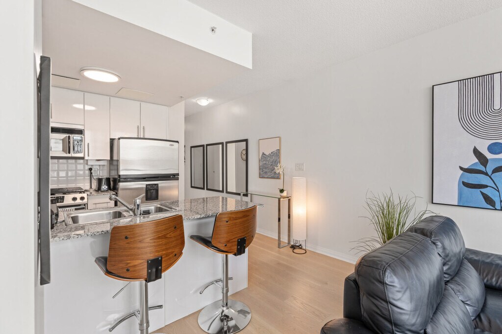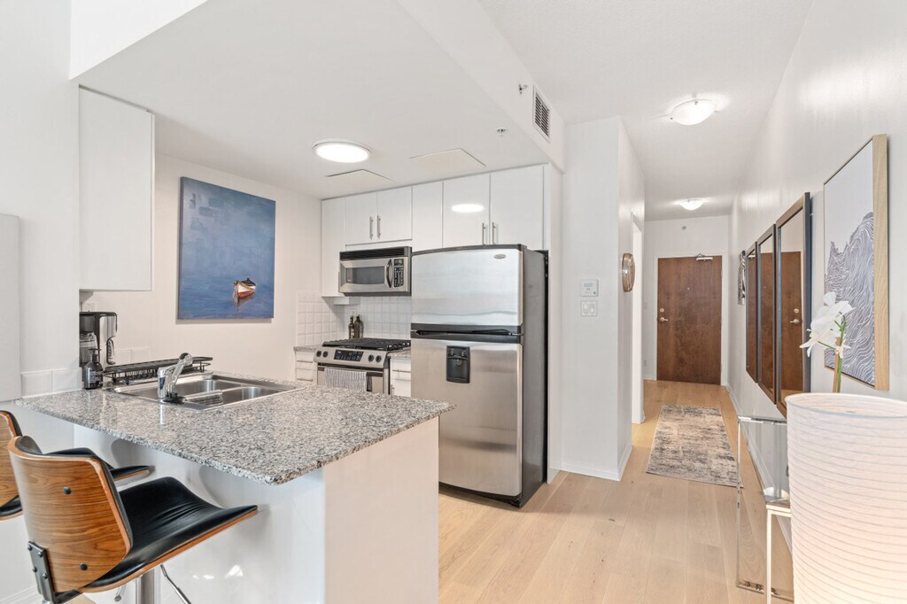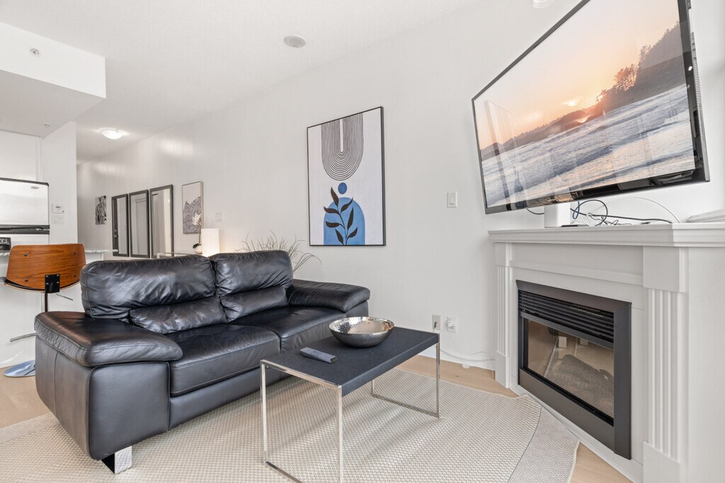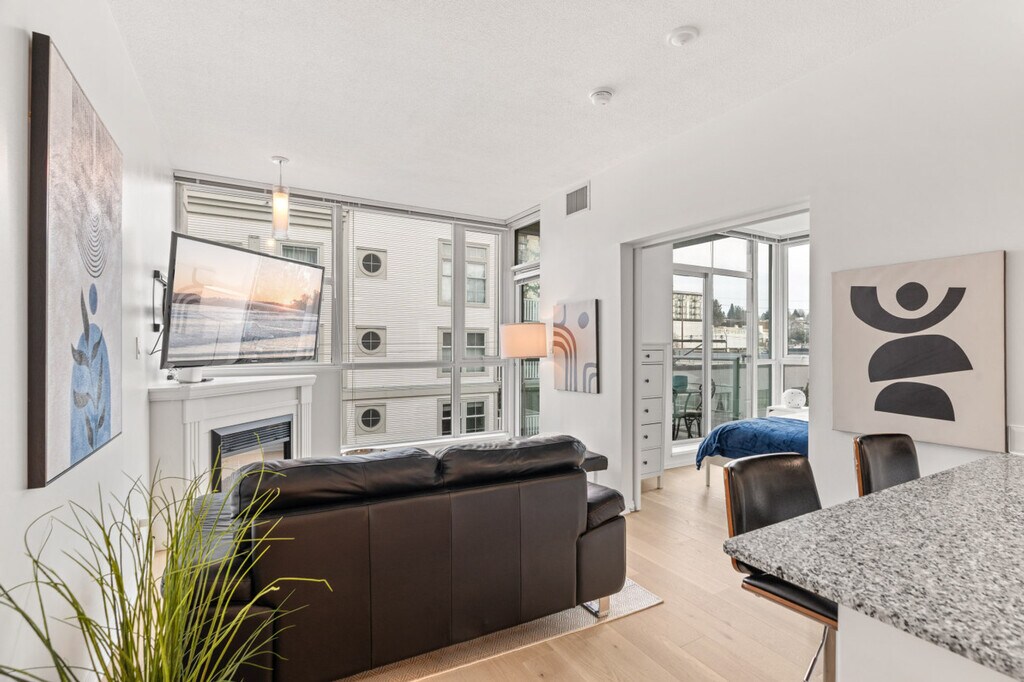 The advertised rate of C$3,595/month is the lowest available price, based on a 1 month(s) stay with a move-in date of April 1, 2026. Rates vary depending on the duration of stay, season, and other parameters. For exact pricing and additional pricing components, please visit our website and enter your desired move-in and move-out dates. The rate is applicable when billed upfront; it can be higher if billed in multiple payments. Feel at home in this bright, modern 1-bedroom condo in the heart of Lower Lonsdale, located on the 6th floor. This thoughtfully designed suite features floor-to-ceiling windows and a private balcony. This suite offers a cozy living area with a fireplace and a Smart TV, and a full kitchen with island seating. It also includes a modern bathroom featuring a tub/shower combination and ample storage, in-suite washer and dryer, and central heating and air conditioning for year-round comfort. One secure underground parking stall is included. A Pack 'n Play and highchair are available upon request for $75 CAD each. Lower Lonsdale is known for its restaurants, cafés, breweries, and boutique shops. The nearby Shipyards District hosts seasonal events and markets, while parks and scenic walking paths are just minutes away. With quick access to transit and everyday essentials, the area offers a perfect balance of urban convenience and relaxed North Shore living. The Shipyards District is about an 8-minute walk, Lonsdale Quay Market is about a 5-minute walk, and the SeaBus Terminal (Downtown Vancouver) is about a 10-minute walk. Grouse Mountain is about an 18-minute drive and Capilano Suspension Bridge is about a 13-minute drive. Small dogs (up to two) are welcome; however, cats are not allowed. There are security cameras at the building's lobby. Well-suited for professionals and mid-term stays, it offers a dedicated workspace. This centrally located condo offers excellent connectivity, with multiple bus routes just steps away and the SeaBus within walking distance for quick access to downtown Vancouver. Drivers will appreciate easy connections to Highway 1 and the Lions Gate Bridge, while the highly walkable neighborhood makes it simple to reach restaurants, shops, and daily essentials without a car. This property uses an in-person key handoff upon check-in. The team will coordinate the exact time and meeting point before arrival to ensure a smooth check-in experience. [SI]