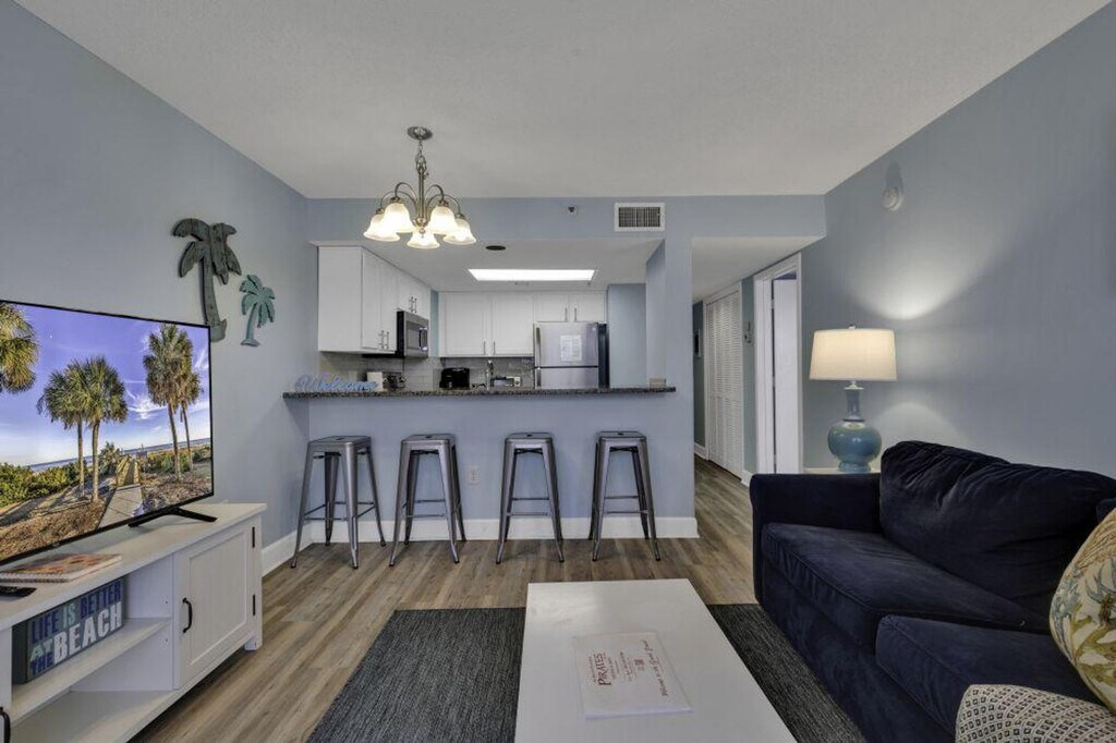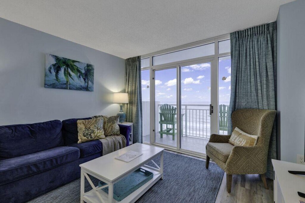 Escape to a breathtaking 2-bedroom beachfront condo at a beautiful resort, where stunning ocean views and unforgettable sunrises and sunsets are just a step away from your private balcony. Experience the perfect blend of relaxation and adventure as you start your day with a refreshing dip in the pool or a stroll on the beach. Located in the heart of Myrtle Beach, the condo is just steps away from all the major attractions, shopping, and dining experiences that the area has to offer. You'll be just a few blocks from the famous Myrtle Beach Boardwalk, Sky Wheel, and Pier, making it the ultimate vacation destination for those looking for the ultimate beach getaway. This condo features a private balcony with waterfront views and a fully furnished kitchen with major appliances and cookware. Enjoy free Wi-Fi, TV, and other in-unit entertainment options in this family-friendly resort. Relax in the tranquil oceanfront pool, 150 ft. long Lazy River, outdoor hot tub spa, kiddie pool, and indoor pool with hot tub. Free parking is available for 2 cars. Parking lots are located on Withers Street parallel to Ocean Blvd. and one street over from the resort. Located centrally on Ocean Boulevard in Myrtle Beach, this condo is close to the strip, blocks away from the Boardwalk, and near boutiques and souvenir shops. It's just a short drive to the Sky Wheel and Ripley's Believe it or Not Museum. Coastline Pest Control performs mandatory preventative treatments in every unit on the 3rd Friday of each month. In case guests fail to leave bracelets in the unit, they will be charged an extra $25 per item for replacement. Grilling is prohibited and any violation of this policy will incur a $200 fine. Bicycles, motorcycles, mopeds, and trailers are not allowed. No smoking in the unit or on the balcony, with any violation incurring a $250 fine plus cleaning costs. No pets allowed, with any violation incurring a $200 fine. Gatherings of more than 6 people including both overnight guests and visitors are not allowed and may be subject to eviction. House parties and illegal substances are strictly prohibited and grounds for immediate eviction. You must be at least 21 years old to book this property. Leaving the unit later than the check-out time will incur a late check-out penalty starting from $500. For same day late check-ins, you need to get the host's approval before booking. Upgraded internet with 200mbs/20mbs speed is perfect for working from the beach. A laptop computer is not included. [SI]