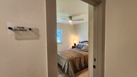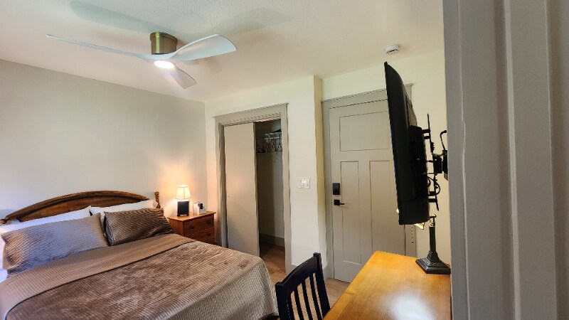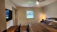 Property Id: 2148857 The Clinch is an expanded upstairs bedroom with full bed, desk, double nightstands, and Roku TV in a remodeled Knoxville home for travel medical professionals. Semi-private bath with large shower, single vanity & 2 bath linen sets. Sound-insulated walls, keypad lock, ceiling fan, linens included. Access to kitchen, laundry & living areas. Property Overview: