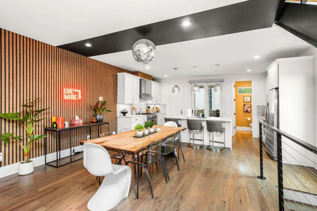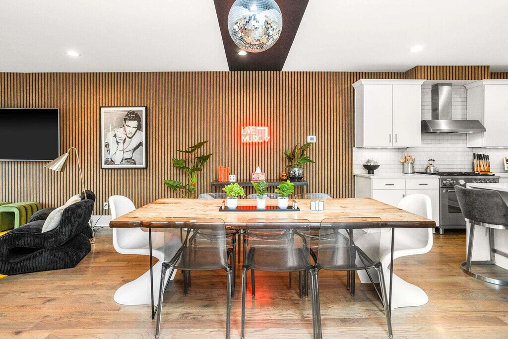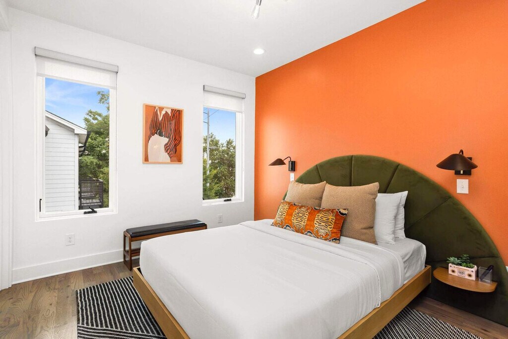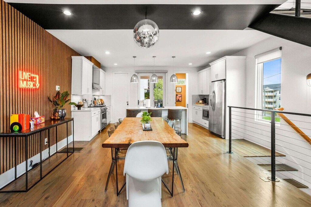 Welcome to this vibey retreat, part of a premium Nashville collection of boutique vacation rentals on legendary 8th Ave South. Just 2.3 miles from Broadway and closer to The Gulch and 12th South, this apartment is walkable to Hattie B's, live music at The Basement and Eighth Room, Zanies comedy, and 8th & Roast coffee. Professionally designed with upscale amenities, it includes a 2-car garage and hotel-grade linens, making it perfect for your Nashville visit. This thoughtfully designed 4-level home accommodates up to 12 guests, offering a perfect balance of togetherness and personal space. Bedrooms are located on levels 1, 3, and 4, each with private ensuite bathrooms. The expansive 2nd level serves as the heart of the home with an open-concept kitchen, dining, and living area flowing onto a balcony off the kitchen, plus a convenient half bath. The 4th-level lounge doubles as a second living area with seating, a TV, and its own private patio accessible through a sleek modern garage-style door. With 2 living areas, 3 outdoor spaces, and every bedroom having its own bathroom, this layout eliminates typical group rental challenges, ensuring comfort and flexibility for everyone. Early check-in or late check-out must be pre-arranged. If the night prior to your stay is available, it can be blocked off for you at half the price for an early check-in. Similarly, if there is no one booked the night of your check-out date, the night can be blocked off for a guaranteed late check-out at half the price. Any stay of 3 weeks or more will incur an extra cleaning fee. Situated in a prime location just minutes from Broadway and all major attractions, this apartment is on 8th Avenue South and adjacent to the Waverly Neighborhood. Walk to Hattie B's, Zanies, Baked on 8th, and other local restaurants, cafes, and shops. It's a short drive to popular destinations: 9 minutes to Broadway and Bridgestone Arena, 7 minutes to The Gulch, 5 minutes to Geodis Park, 8 minutes to Nissan Stadium, 4 minutes to 12 South, 6 minutes to Vanderbilt, and 5 minutes to Belmont. Ubers and Lyfts are readily available for convenient transportation. Quiet hours are in place to respect neighbors by keeping outdoor noise levels down. Smoking is not allowed inside or within 25 feet of the property. A $500 fee will apply if smoke of any kind is detected in the home. Excessive mess is not covered by the cleaning fee, and additional fees may apply if the space is not left in good condition. Early check-in or late check-out must be pre-arranged, and any non pre-arranged late check-outs will result in withholding of deposit. A laptop computer is not included. Registration Number: