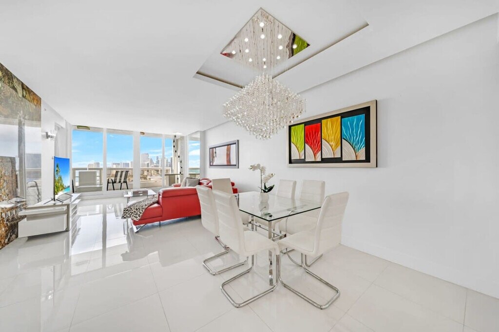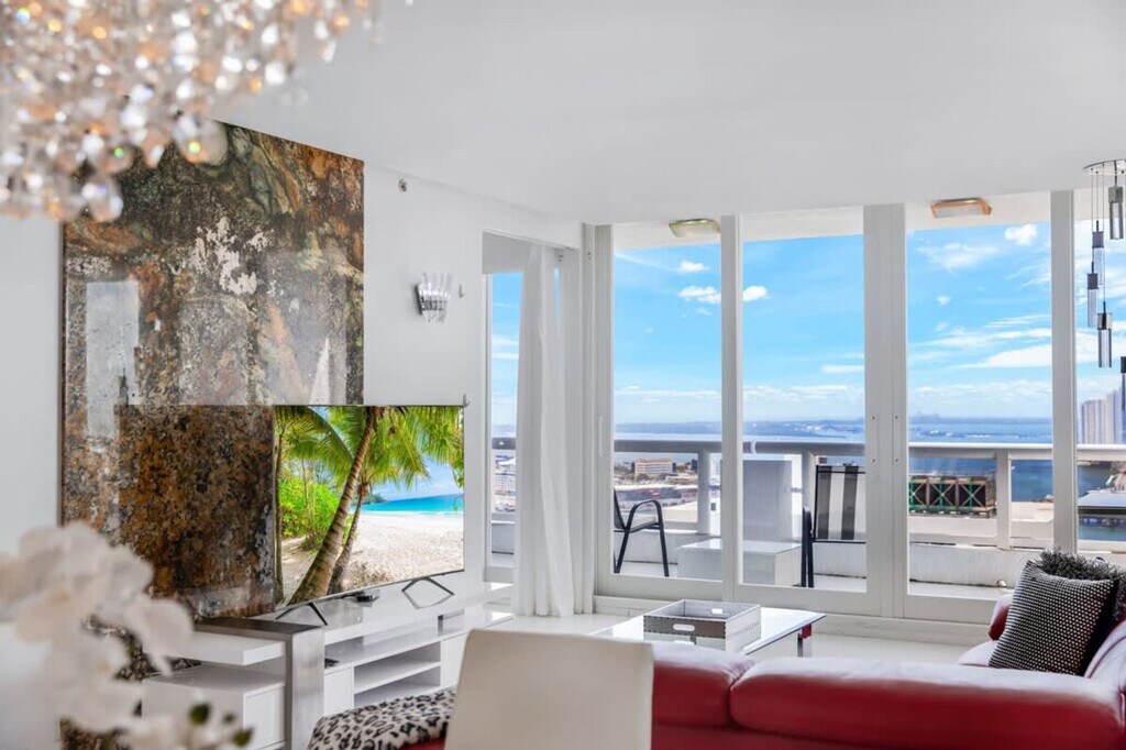 Feel at home in this modern Miami apartment with an amazing ocean view. This top-floor penthouse offers 1,094 square feet of space. Tranquil Oasis Penthouse is a 1,094 square foot unit overlooking Biscayne Bay and features a hot tub available all year. The apartment's occupancy is two adults plus two children. On-site amenities include a fully equipped gym with Peloton bikes and gourmet restaurants. Valet service is the sole parking option if you are staying for less than 21 days, or for stays of 21 days or longer, parking is available for $160 for the entire duration of your stay. Daily valet parking is also available for $48, payable directly to the building. The valet parking garage enforces a height limit of 6'6", which accommodates most large SUVs but excludes trucks or vans. Within the retail lobby, you'll find an Enterprise rental car company. Discover the best of Miami at The Grand. Nestled in the vibrant Edgewater neighborhood, The Grand offers stunning views of Biscayne Bay and easy access to Miami’s most iconic destinations, including South Beach (8 minutes/3 miles), Wynwood (5 minutes), Brickell City Center (2 miles south), Design District (2 miles north), Arsht Center and Kaseya Center, and Downtown Miami nightlife. Lyft or Uber presents a convenient transportation choice when navigating Miami, and you can readily access complimentary public transportation like the Trolley and Miami Metromover. Building Management has strict occupancy rules of two adults only (15 years of age and older) plus two children. Smoking is only allowed on the balcony with all doors closed. If there is evidence of smoking indoors, a minimum $500 fine will be applied plus costs for odor removal and deep cleaning. Check-in is strictly between 4 PM and 10 PM, and late arrivals must be communicated immediately. Check-out is at 11 AM. Luggage can be stored with a bellman for $3 per suitcase before or after your stay if needed. The building is undergoing renovations that include the main lobby, pool, and pool deck, which may cause moderate noise during daytime hours Monday through Friday from 9 AM to 4 PM. The main lobby and front motor lobby are currently closed, though temporary pathways have been created for access. Residential elevators no longer stop at the main lobby, and service elevators must be used to reach the ground level. The residential swimming pool is temporarily closed for necessary repairs and renovations; however, the jacuzzi, pool deck, and solarium remain open. A limited number of daily passes to the Marriott Hotel pool are available on a first-come, first-served basis and must be returned after each use. After reserving the apartment, you are required to provide legible copies of government-issued IDs or passports for all adults aged 15 or older for building registration. The minimum age to book is 21, with no exceptions as per building requirements. Third-party bookings are not allowed unless agreed in advance. Depending on the length of your stay, the building may also require a full residency application within 24 hours of booking, which could include prior residency, employment details, social security number, references, and other personal information. Visitors are only permitted for reservations of 28 days or longer. For shorter stays, no visitors are allowed, and unregistered guests will result in immediate eviction without refund. Any missing remotes, streaming devices, or similar items will result in a charge of $100 per item. We are not responsible for personal belongings left behind, so please ensure you take everything with you at check-out. Includes a dedicated workspace and 400Mbps Wi-Fi. [SI]