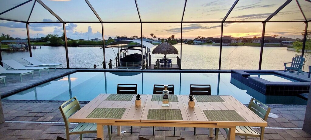 The advertised rate of $9,006/month is the lowest available price, based on a 30 day(s) stay with a move-in date of August 15, 2026. Rates vary depending on the duration of stay, season, and other parameters. For exact pricing and additional pricing components, please visit our website and enter your desired move-in and move-out dates. The rate is applicable when billed upfront; it can be higher if billed in multiple payments. Feel at home in this newly built 5-bedroom modern home in Cape Coral, Florida, where luxury meets tranquility! This one-level home overlooks a heated pool, comfortable patio loungers, a gas grill, and a relaxing in-pool hot tub/spa, offering westward breathtaking views of the canals gulf coast and unforgettable sunsets every evening. This home features two primary suites, both overlooking the water and sunsets. Zero clearance patio sliders allow you to enjoy the Florida life indoors and out. The kitchen island is expansive for easy socializing and preparing meals. For family fun, there is a zone in the garage with darts, ping pong, cornhole, bikes, and more. Keurig and K Cups & Tea are provided for guests' enjoyment. Two pack and plays are available for your little ones. Located in Cape Coral, known for its beautiful canals and proximity to Gulf Coast beaches, this home offers easy access to a variety of outdoor activities, dining options, and shopping destinations. It is directly across from the Coral Oaks golf course and only 35 minutes' drive from RSW airport, and it is nearby to Pine Island. The maximum guest count is 10 allowed on the property. Includes three desks perfect for remote workspaces. [SI]