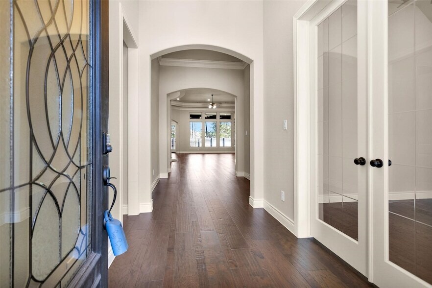 One-story brick and stone home in ARTAVIA with arched covered entry and landscaped front yard. Interior features open living and dining layout with natural light and sightlines to the backyard. Kitchen positioned central to living spaces for everyday use and gatherings. Primary suite separated from secondary bedrooms for privacy. Covered back patio overlooks a manageable fenced yard. Two-car garage and full driveway parking. Located approx 0.3 mi to ARTAVIA lake, boardwalk, park, and trails. Near Honor Cafe, H-E-B, and Market Street The Woodlands. Convenient access to TX-242 and I-45.