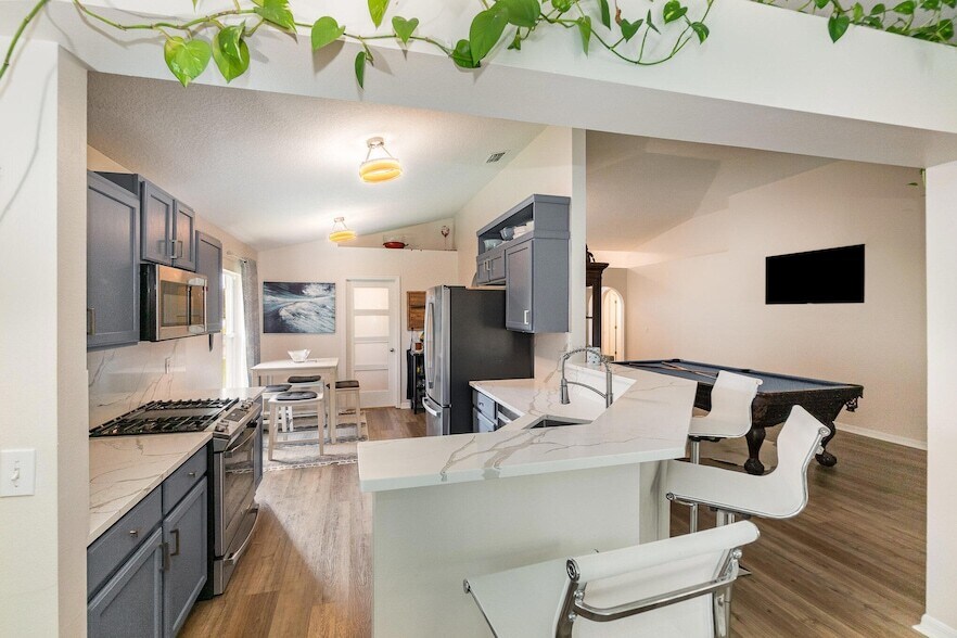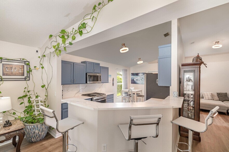 Rent includes lawn care, electric & hoa fees. Community is gated with community pool. Lots of updates within the past years. New luxury vinyl throughout kitchen, bathrooms, laundry room, formal areas & family room. Updated the kitchen with quartz counter tops, stainless steel appliances & added gas for range. Breakfast bar off the family room and wraps around into formal area plus there is a breakfast nook in kitchen. Upgraded bathrooms with quartz counter tops & new toilets. New light fixtures & new laundry room door. Continue out to your new fenced in backyard with paver patio. Solar panels for energy efficiency. Screened in front entry & screen sliders on the garage. Roof 2022, A/C added in 2020, Water Heater 2020. Popcorn ceilings removed.