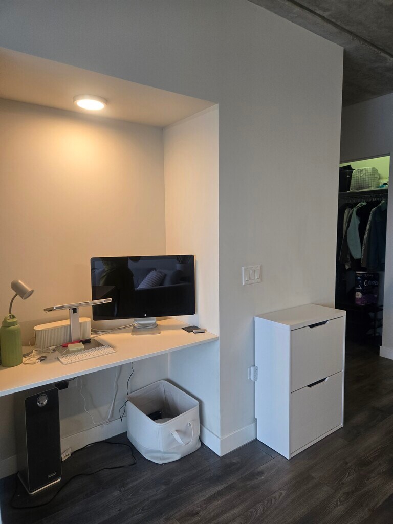 SUBLET THROUGH 7/13/26 with option to renew -- Enjoy the perks of Bucktown's upscale 606 Blue -- a newer construction building that combines updates with neighborhood charm of the Wicker Park area. This one-bedroom is fully loaded with in-unit laundry, plank flooring throughout, central AC, floor-to-ceiling windows and a built-in office nook for WFH days! Spanning almost 700 square feet, the unit comes with an updated kitchen with stainless steel appliances -- including a dishwasher, microwave and garbage disposal -- and offers plenty of space for a dining table or island. The open-concept layout blends the kitchen and living room into one, with ample space for cozy couches and living room furniture. The bedroom with hold at least a queen bed and offers a walk-in closet. The bathroom includes a glass-walled shower and two entryways, one from the living room and another from the bedroom. All utilities -- as well as Internet -- are included in a monthly, $150 utility fee, Only electric is additional, averaging $30/mo. There's easy street parking, or reserved garage spots for $280/mo. The building also offers bonuses such as a gym, package lockers, a conference room and a roof deck with a stunning view of the Chicago skyline. Unit is empty and easy to show. Call today! *** Unit is being offered at market rate with open to renew.