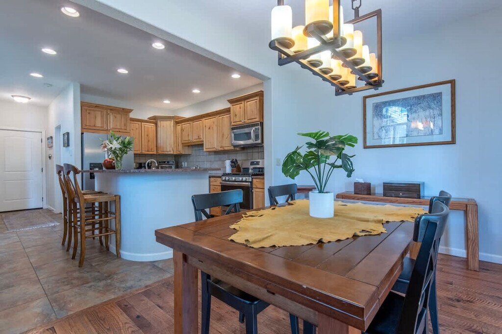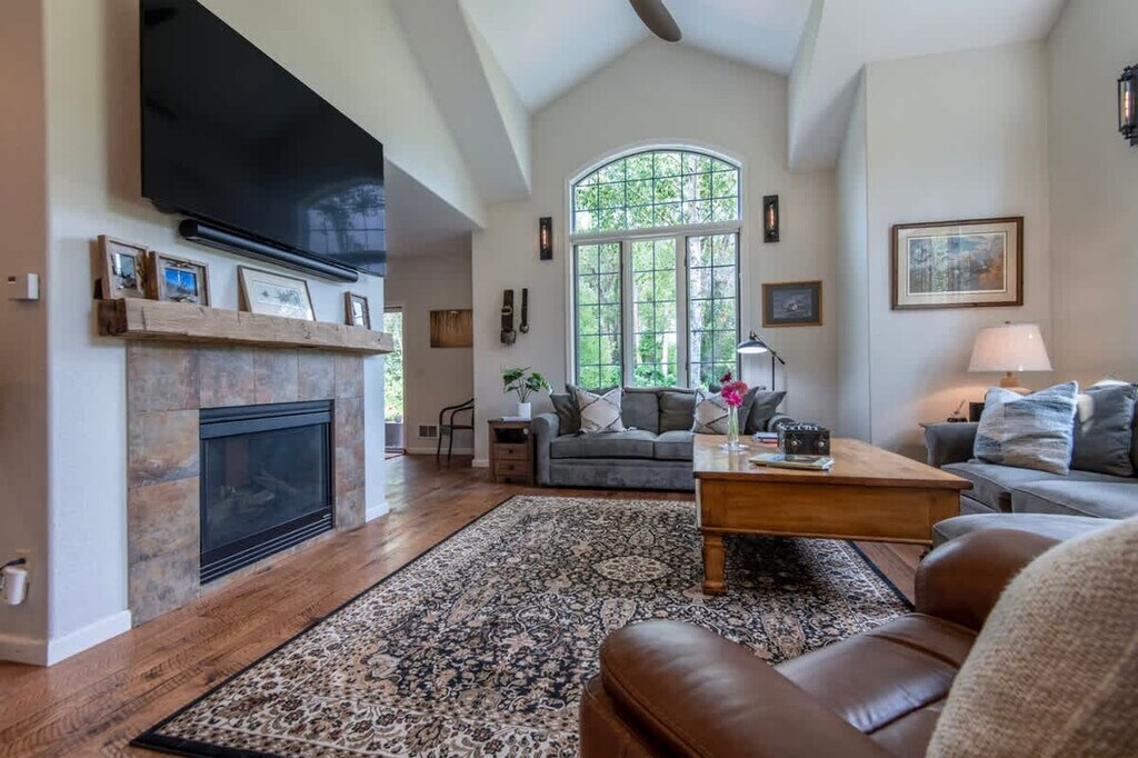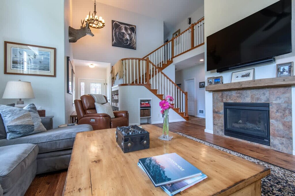 Feel at home in this spacious and comfortable home nestled in the serene heart of the Tetons. This home is the ideal basecamp for skiing adventures at Grand Targhee Resort and comfortably sleeps 8 guests. All bedrooms are upstairs. The master bedroom features a king-size bed and a flat-screen TV. One room has two queen-size beds, while another boasts a queen-size bed and a flat-screen TV. The master bedroom has its own full bath with a luxurious jacuzzi tub and shower, and the two queen bedrooms share a full bath. There is also a convenient half bath downstairs. The fully equipped kitchen includes a new water heater located in the downstairs half bath closet, a fridge that's just a year old, a gas oven and cooktop, and an air fryer/toaster oven. Relax in the living area with a 78” TV and Sonos surround sound and enjoy cozy evenings by the two-sided gas fireplace. Up to 2 pets are welcome with a pet fee. This home is perfectly situated to experience the best of the Teton Valley during the winter. It is just a short drive from Grand Targhee Resort, offering easy access to world-class skiing and snowboarding. Discover the winter charm of nearby towns like Victor and Driggs and enjoy local restaurants, bars, and unique shops, all within a short distance from this home. The neighborhood is Aspen Point. Quiet Hours are from 9 pm to 8 am and guests should be respectful to the neighbors. No events are allowed, including parties, large gatherings, and weddings. Smoking or vaping is prohibited in the home or on the decks, and if any butts are found on the property, an additional charge will be applied. If pets are brought onto the property without paying the pet fee, or if more than two pets are brought onto the property without authorization, the booking may be terminated immediately. If pet hair is found on furniture or bedding, there may be an additional fee. Noise complaints resulting from kenneled pets may result in the termination of your stay. Fines will apply for violations including but not limited to leaving garbage in house or litter on grounds, failure to disclose or clean up after pets, smoking in house or garage, failure to follow house rules and respect posted signs, failure to follow check-out procedure, mistreatment of hot tub, or violations of local laws. A minimum $500 fine will be applied for smoking/vaping/marijuana in the house or garage, violation of house rules, posted signs, laws, or failure to vacate at check-out time. [SI]