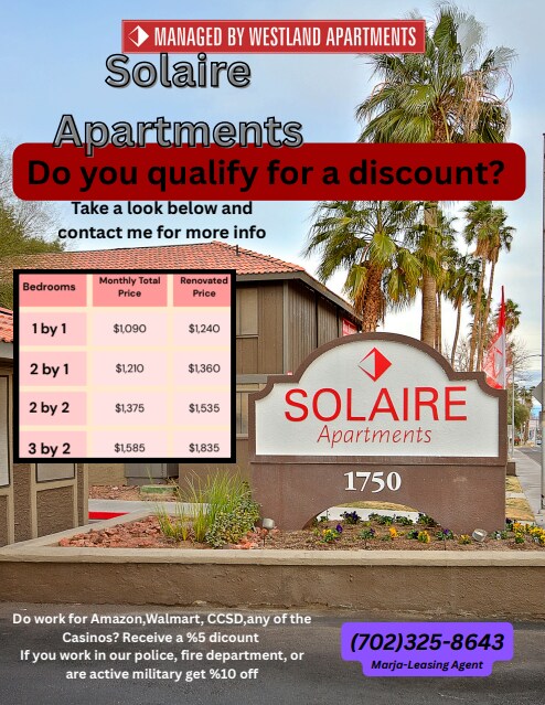 Property Id: 2068920 Solaire Apartments 1750 Karen Avenue, Las Vegas, NV 89169 Open Monday to Saturday | 9:00 A.M. - 6:00 P.M. Walk-ins welcome or call ahead to schedule a tour. Available Now - 1 Bedroom, 1 Bathroom Move-in Special - Limited Time Only! First Full Month Rent Free!!! Call the leasing office for full details. Pet Friendly: • Max 2 pets, up to 40 lbs each • $300 one-time fee • $40/month pet rent (Some breed restrictions apply) Rental Requirements : We ask you make 2x the rent with verifiable income Evictions or rental collection in the last 5 years must be paid off and if older need to be under $2,500 No active warrants; No felonies in the last 7 years or convictions relation to weapons, sex, drugs, or violence The deposit ranges from $500-$1,000 depending on you meeting the above requirements and if I can verify your current address and you've had the same income for the last 3 months
