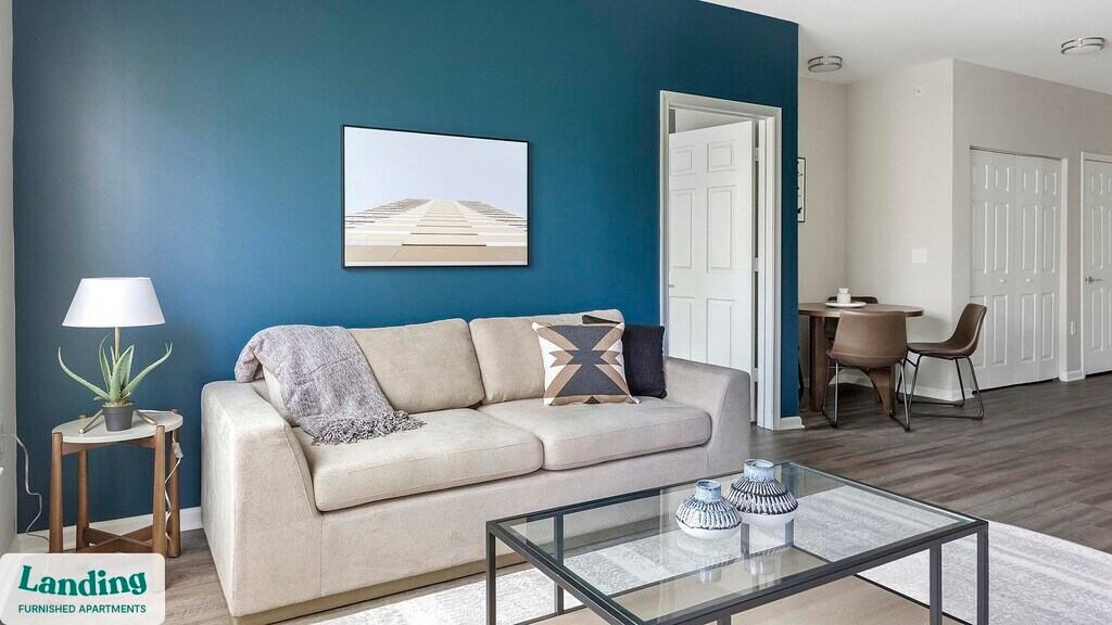Landing offers flexible lease terms from weeks to months. Please always visit our website or contact us for the latest pricing & availability. Stay longer, save more: 6-Month Minimum base rent: starts at $2950/mo 12-Month Minimum base rent: starts at $2567/mo Landing offers flexible leases across a network of over 35,000 fully-furnished apartments throughout 375+ cities so you can rent on your terms, practically anywhere, and avoid the hassle of paying deposits or application fees. Visit to learn about all the benefits of a Landing membership, see our competitive up-to-date pricing, explore available apartments, take virtual tours, and make reservations online without jumping through traditional rental hoops. Landing's apartments at Riverview Landing at Valley Forge are designed for comfortable, easy living, with the ability to stay as long as you like. Experience living with Landing Every apartment is outfitted with all the modern essentials including: custom-designed furnishings, a fully-equipped kitchen with deluxe stainless steel appliances, a gourmet coffee maker, premium linens, Smart TVs, and incredibly fast, reliable internet for working from home. When you live with Landing, you'll enjoy a hassle-free experience with the added benefit of 24/7 access to our dedicated member experience team. Some of the nitty-gritty: a background check and proof of income are required; we're completely smoke-free; bundled utility packages and pricing vary based on length of stay; pet-friendly options available; listed price reflects a 12-month minimum stay.