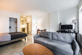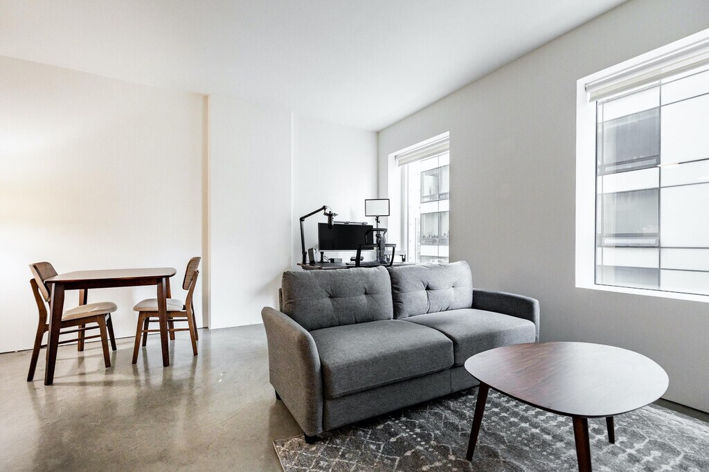Steps from upscale restaurants, museums, and high-energy nightlife, this fully furnished studio apartment in the heart of SoMa is custom-designed for the remote worker looking for a comfortable and inspiring environment. The unit includes a fully equipped kitchen, full bathroom, Nespresso coffee machine, in-unit laundry, smart TV, and all utilities. Feel at home with access to indoor and outdoor terraces and lounges, an outdoor pool, fitness center, business center, and more. Most importantly, it features a full home office set-up with private high-speed internet that you won't find anywhere else. There is no air conditioning in this unit. Internet speeds are not guaranteed and may fluctuate based on your computer model and the router location. A laptop computer is not included in the home office set-up. Early check-in from 10am-3pm will incur a fee of $75 and before 10am will incur a fee of 1 full night's rent (based on selected dates). Late check-out from 11am-3pm will incur a fee of $75 and after 3pm will incur a fee of 1 full night's rent (based on selected dates). Late check-outs must be requested at least 48 hours in advance. Includes private high-speed internet, standing desk (Autonomous), work chair (Autonomous), 34-inch ultra-wide monitor (Samsung), microphone (HyperX), webcam (Logitech), computer speakers (Logitech), key light, monitor light (BenQ), green screen, keyboard (Logitech), mouse (Logitech), laptop stand, and TOTU 16-in-1 Triple Display USB-C 3.1 Docking Station. [SI]