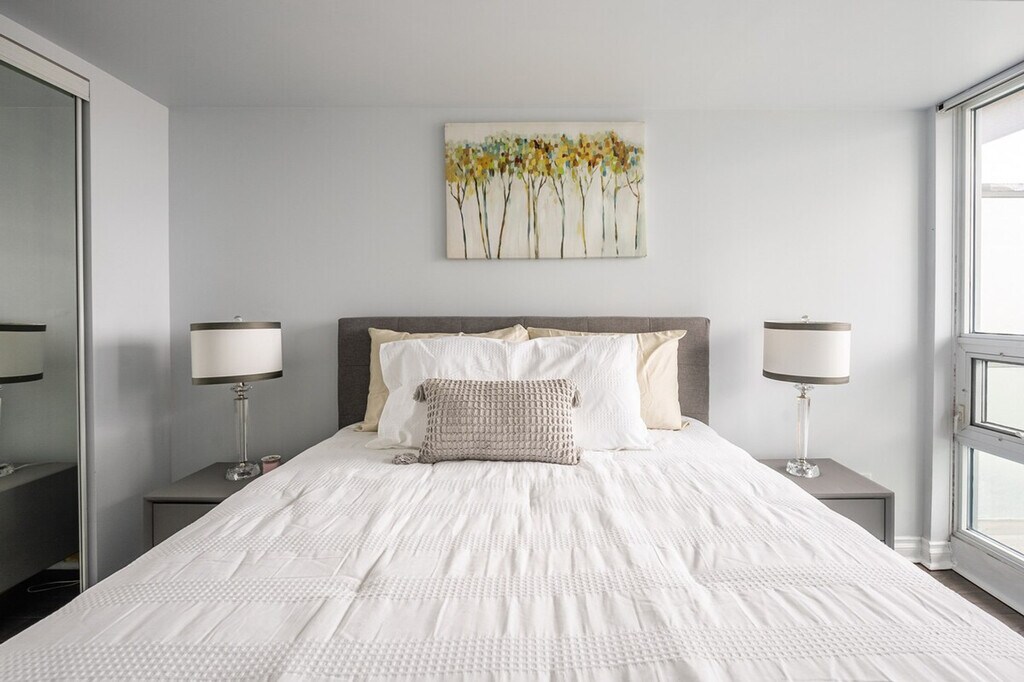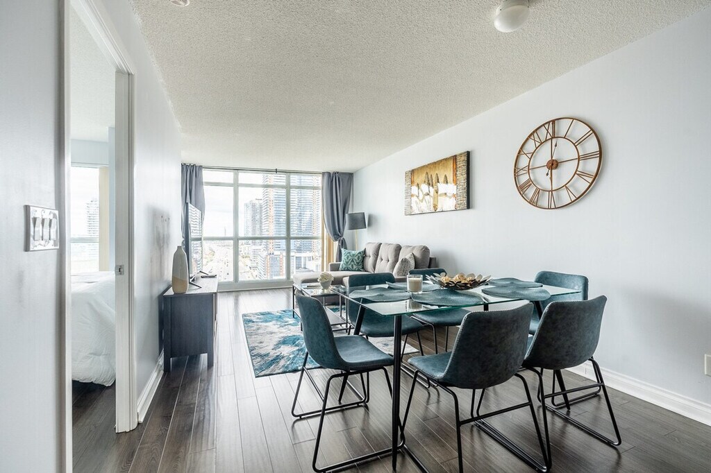 Immerse yourself in Toronto’s bustling energy and feel at home in this comfortable suite on the 22nd floor, with a balcony to enjoy the view of downtown Toronto. This suite has everything you need to make you feel right at home, including a fully functional kitchen with tea, coffee, a kettle, a coffeemaker, and a toaster. There is also a washer and dryer. The 2 bathrooms are stocked with towels, shampoo, conditioner, body wash, a hair dryer, and other toiletries. Paid underground parking with in/out privileges is available upon request for $10 per night. Please request in advance as it could be booked. A travel crib (for babies 0-18 months) and bed rails are available for $5 per item per night; please book in advance. Pets are allowed in the apartment with a fee of $10 per pet per night; please confirm the opportunity prior to booking. The condominium building is a 15-minute walk from CN Tower and under a 20-minute walk from Yonge&Dundas Square, making it ideal for business travelers and sightseeing. Metro Toronto Convention Centre is a 15-minute walk away. Union subway and railway station is just a 10-minute walk from the building, making it easy to get around without a car. Many main attractions such as the CN Tower, Ripley’s Aquarium, and St. Lawrence Market are less than 20 minutes away on foot. The Kitchen Table, the closest grocery store, is 400m away, and the area also has plenty of restaurants. Guests whose names or IDs do not match the information given are not allowed into the building. Guests must be 18 or over in order to check in. Registration Number: STR-2209-HWWBHL [SI]