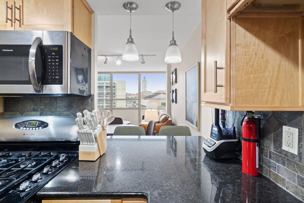 The advertised rate of $3,202/month is the lowest available price, based on a 1 month(s) stay with a move-in date of June 19, 2026. Rates vary depending on the duration of stay, season, and other parameters. For exact pricing and additional pricing components, please visit our website and enter your desired move-in and move-out dates. The rate is applicable when billed upfront; it can be higher if billed in multiple payments. Welcome to this quiet corner of downtown Austin, where comfort meets convenience! Feel at home in this property located right across the street from the University of Texas, Austin. Each bedroom includes a king-size bed and a desk with an external monitor for remote work. Enjoy blazing-fast 1Gbps internet. The fully stocked kitchen features stainless steel appliances including a stove/oven and microwave, pots, pans, bakeware, coffee supplies, a toaster, a blender, wine and champagne glasses, a dishwasher, and cleaning supplies. There is a dining area with seating for 4. A high chair is provided upon request. Your stay includes one parking spot in a covered garage, but a compact vehicle is recommended due to the tight fit. One pet is allowed. You can walk to a variety of high quality restaurants, the downtown nightlife, and sporting and music attractions. The Texas State Capitol, UT Austin, Bullock Texas State History Museum, Blanton Museum of Art, Texas Capitol Mall, Moody Center, Texas Chili Parlor, Olamaie, TCBY, late night eats such as Raising Canes, Chick-Fil-A, P Terry's, City Target, and a 24-hour 7-11 are all within walking distance. Guests staying overnight may stay up to three days. No smoking or vaping is allowed in the building; there is a dedicated area outside far enough from the building where smoking is allowed. Includes a desk with an external monitor. There's only one dedicated parking space, and it's a tight fit. If you have an additional car, we can help you find monthly parking nearby. [SI]