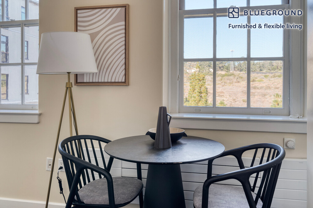 Show up and start living from day one in San Francisco with this beautiful one bedroom Blueground apartment. You’ll love coming home to this thoughtfully furnished, beautifully designed, and fully equipped Presidio of San Francisco home. (ID #SFO1457) The advertised rate of $3,960/month is the lowest available price, based on a 12 month(s) stay with a move-in date of March 16, 2027. Rates vary depending on the duration of stay, season, and other parameters. For exact pricing and additional pricing components, please visit our website and enter your desired move-in and move-out dates. The rate is applicable when billed upfront; it can be higher if billed in multiple payments. Brokers are welcome to reach out. Were you looking for an unfurnished lease? Try Blueground instead and upgrade from unfurnished to furnished living: - Furnished at rates comparable to unfurnished - No setup or furniture costs - save thousands - Move-in ready - save time, just bring your suitcase Designed with you in mind As with any Blueground apartment, you’ll find a thoughtfully designed space complete with beautiful furniture and a fully equipped kitchen in this one bedroom property. And, thanks to our superior quality mattresses, luxury linens, and towels, you can relax knowing you’ll always feel comfortably at home. When you’re ready for some fun, you can take in the San Francisco vibes or bring the entertainment to you with the premium wireless speaker or smart TV. This apartment also offers in-apartment laundry. Sleeping arrangements Queen Bed, 63in/160cm Amenities Building amenities unique to this one bedroom apartment include an on-site: - Dryer - Elevator - Washing machine - Parking Arrival and ongoing support The entire apartment is yours to enjoy! Throughout your stay, you’ll have access to our Client Experience team through the Blueground App. You can schedule additional cleanings, submit maintenance requests, and view our neighborhood recommendations with just a few taps. We’ll share all details upon confirmation of your stay. Other things to note Building amenities may have an extra cost. This Blueground apartment has flexible lease options, allowing you to book it for one month, a year, or more. Parking is offered based on availability and is subject to a fee. We take great pride in ensuring every photo displayed is shot in our own units with our actual furnishings. That said, we regularly refresh our decor and furniture arrangement, which may differ from what’s pictured. [SI]